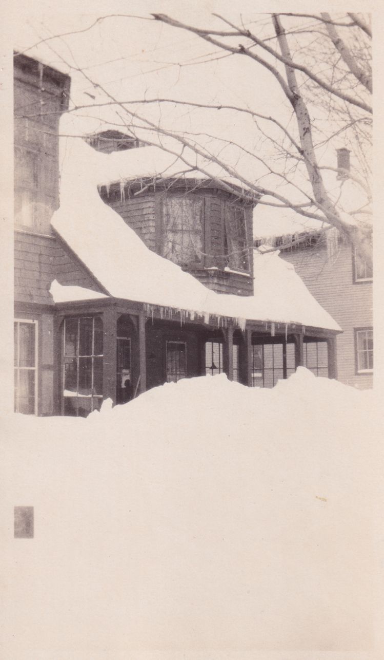 Black and white photograph of a cure cottage covered in snow. The view of the front porch of the cottage is blocked by a large snow drift.