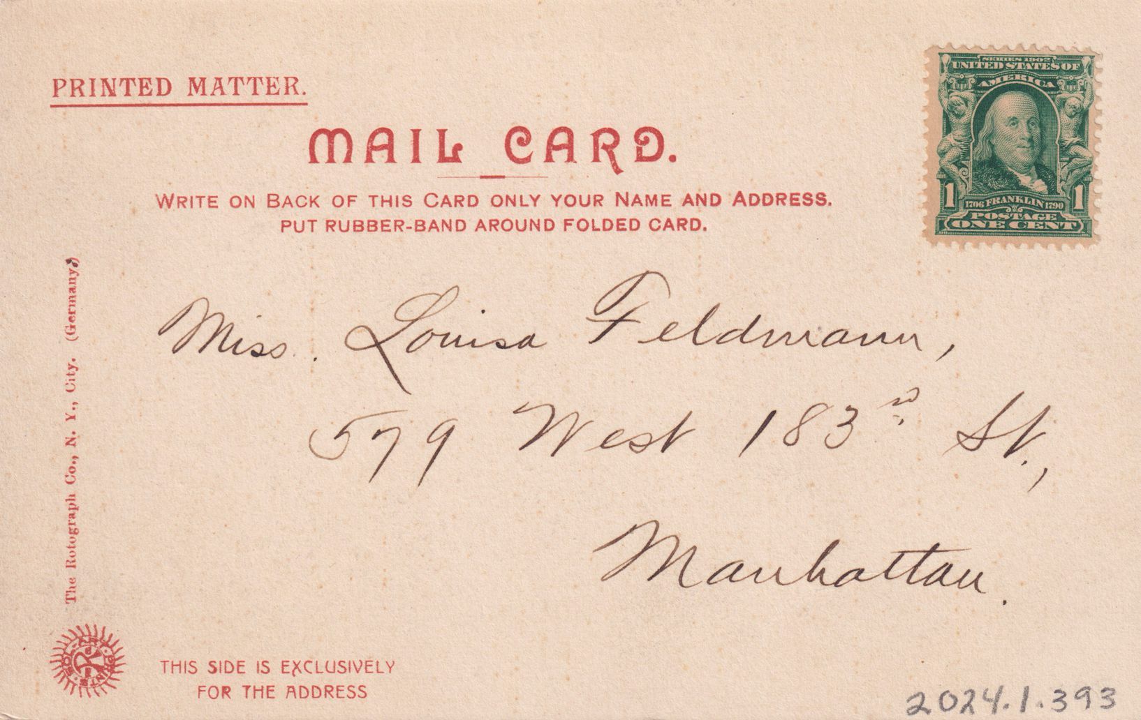 Postcard with an photograph of the Ampersand Hotel on the edge of Lower Saranac Lake. The postcard is addressed to Miss Louisa Feldman.