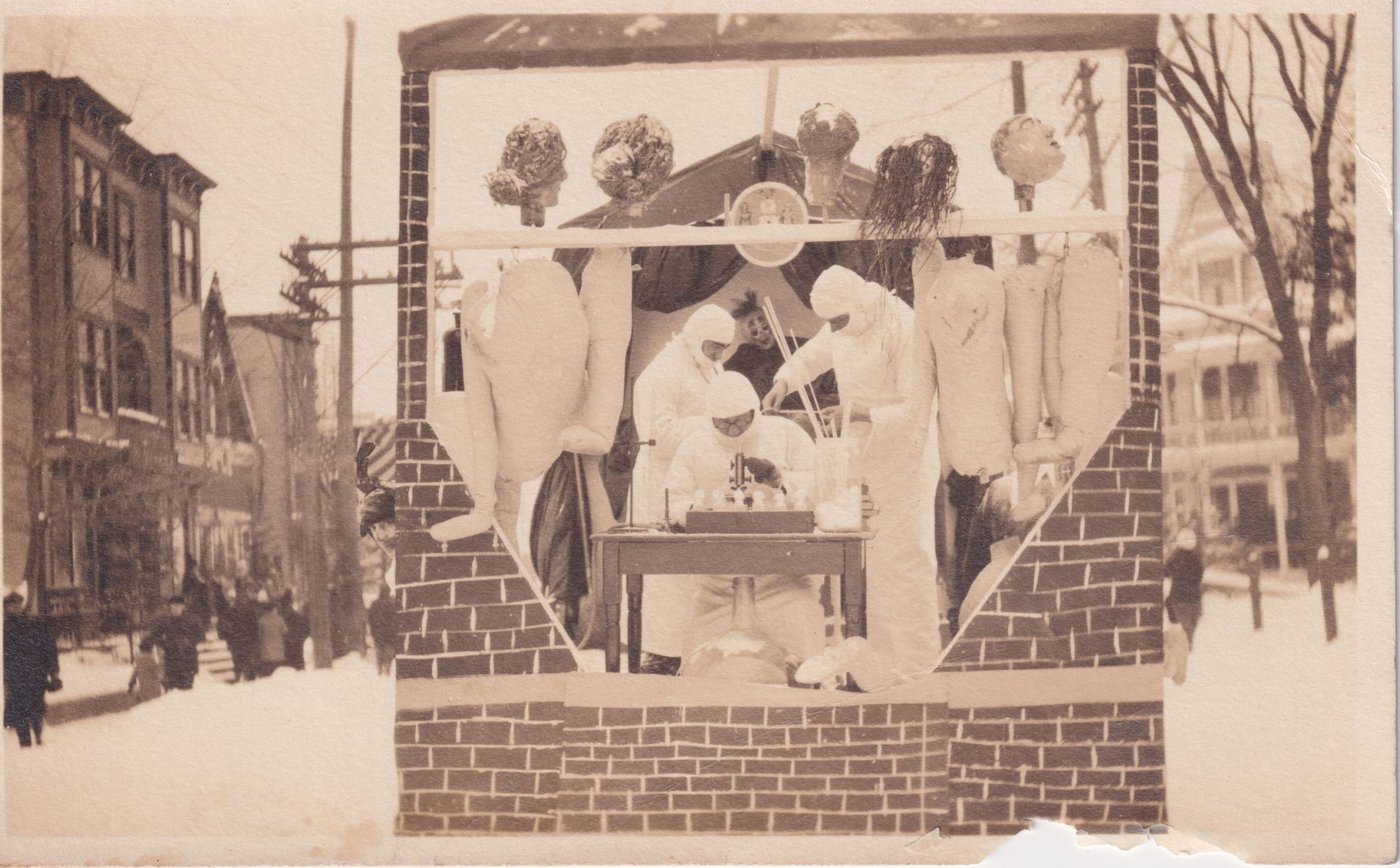 Photograph postcard showing an image of the "Eugenic Factory" float created by the patients at the New York State Hospital for Incipient Tuberculosis,, AKA Ray Brook Sanatorium, that appeared in the 1915 Winter Carnival Parade in Saranac Lake. Marked Kollecker Photo, Saranac Lake, N.Y. Postcard backing is unused.