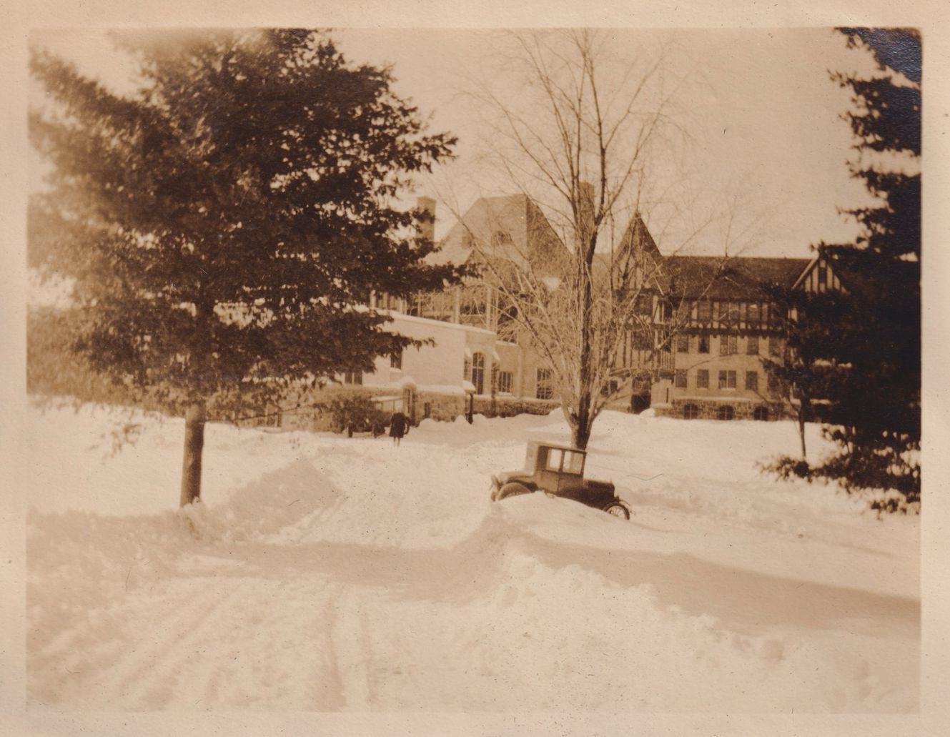 Black-and-White photograph of the National Vaudeville Artists' Home in the snow, as seen through trees. There is a car parked along the driveway.