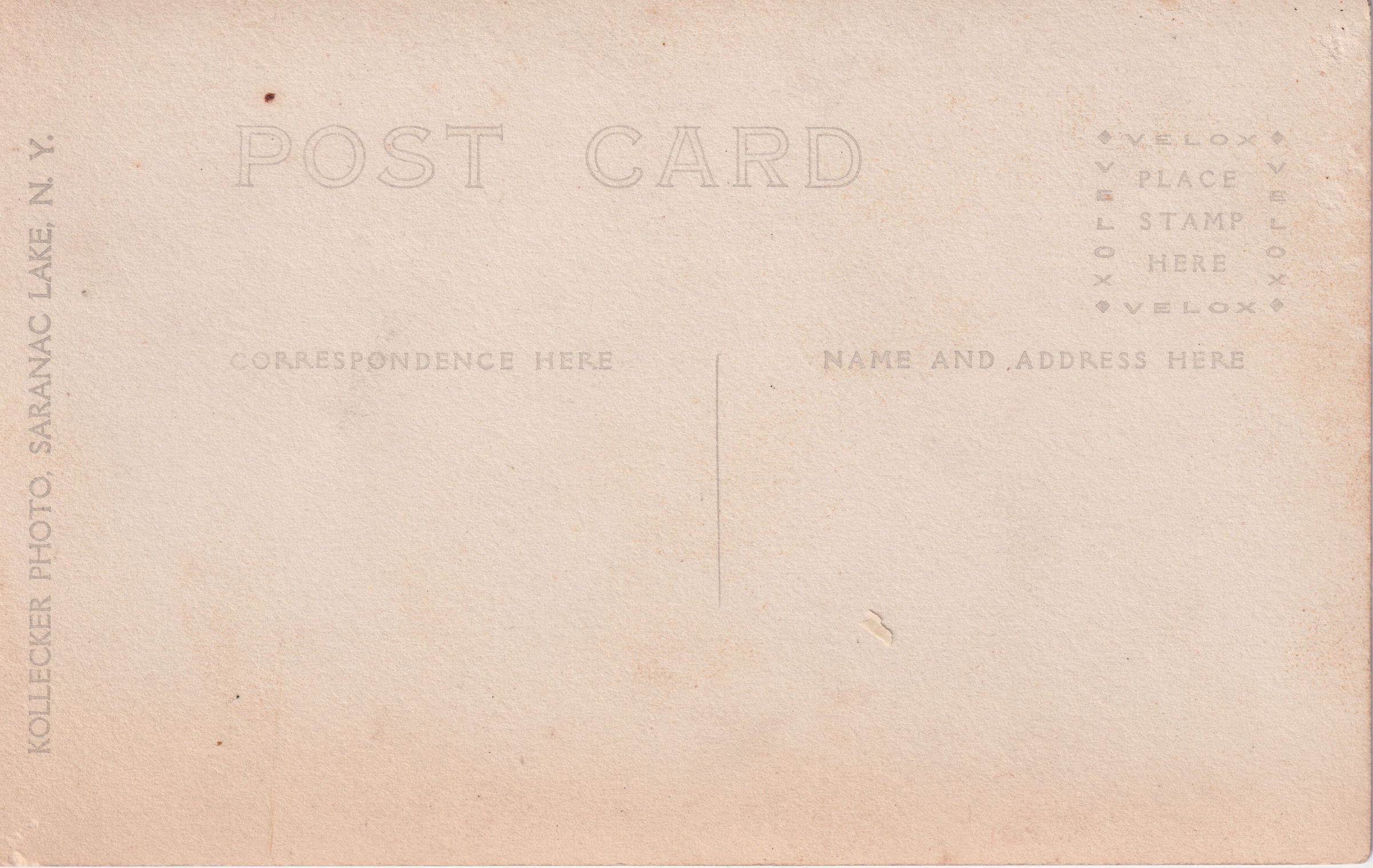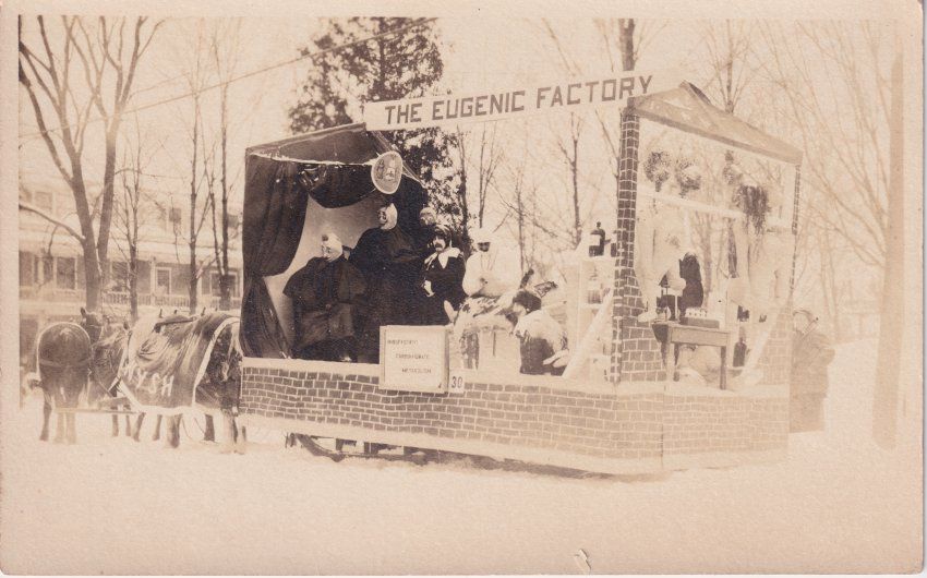 Photograph postcard showing an image of the "Eugenic Factory" float created by the patients at the New York State Hospital for Incipient Tuberculosis, AKA Ray Brook, that appeared in the 1915 Winter Carnival Parade in Saranac Lake. Marked Kollecker Photo, Saranac Lake, N.Y. Postcard backing is blank.