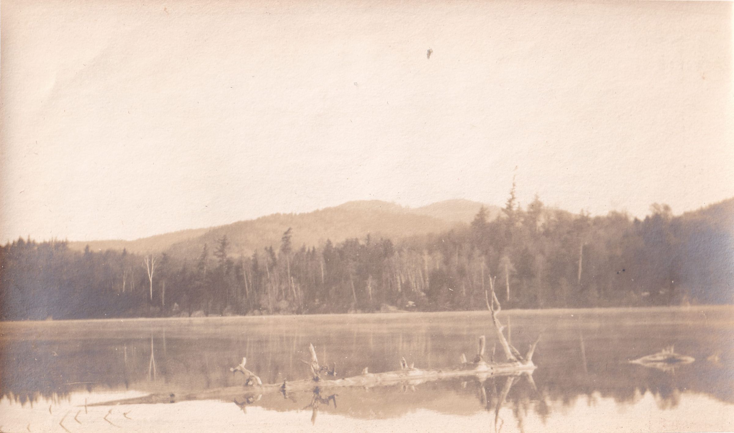 Photograph of an unidentified body of water. Trees are visible on the far bank, with mountains in the distance. There is a tree floating across the surface of the water.