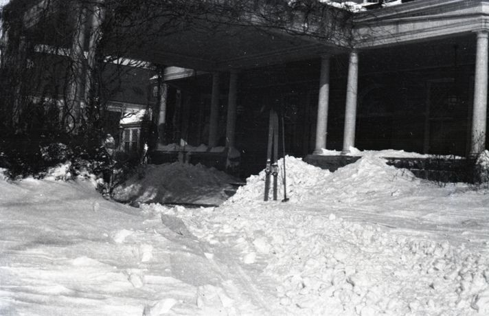 Negative of a snowy yard outside of a large unidentified building. There is a set of skis set upright in the snow near the front of the building. Most likely taken by Mary Ives Baldwin. This item is not fully cataloged but has been uploaded so the image is publicly available; if you would like us to prioritize cataloging this item, please contact the HSL Collections team.