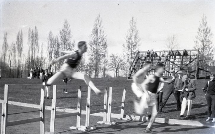 Negative of an outdoor track race. Three blurry racers are running on a dirt track, two just past a line of wooden hurdles and one midair above one. There are spectators standing to the side and wooden stands in the background. Most likely taken by Mary Ives Baldwin. This item is not fully cataloged but has been uploaded so the image is publicly available; if you would like us to prioritize cataloging this item, please contact the HSL Collections team.