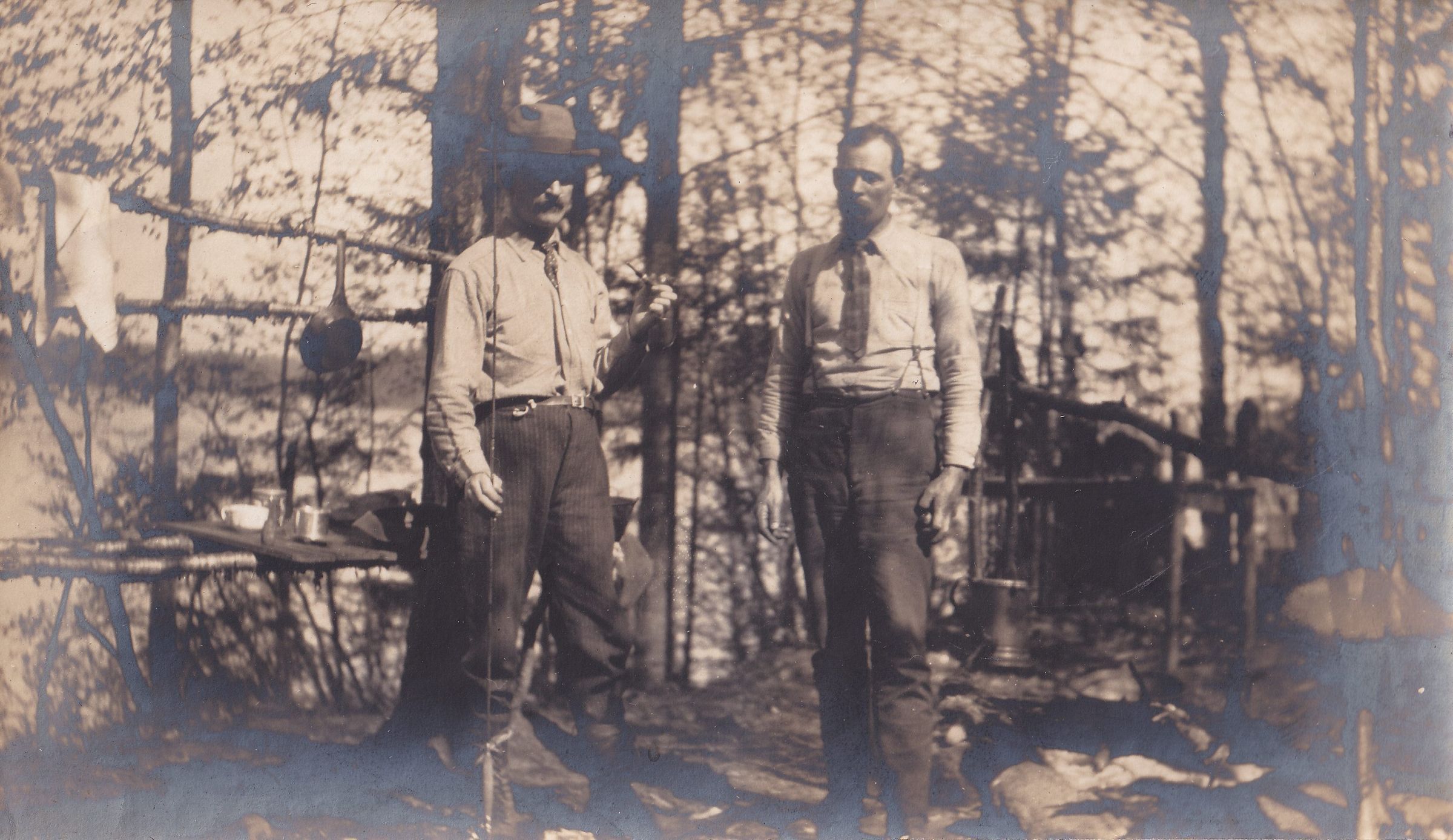 Photograph of two men standing at a campsite in the woods. The man on the left in the hat is John "Jack" Carrier. The man at right is unidentified. Jack holds a fishing pole in his right hand and a pipe in his left. Camp cooking supplies can be seen behind them.