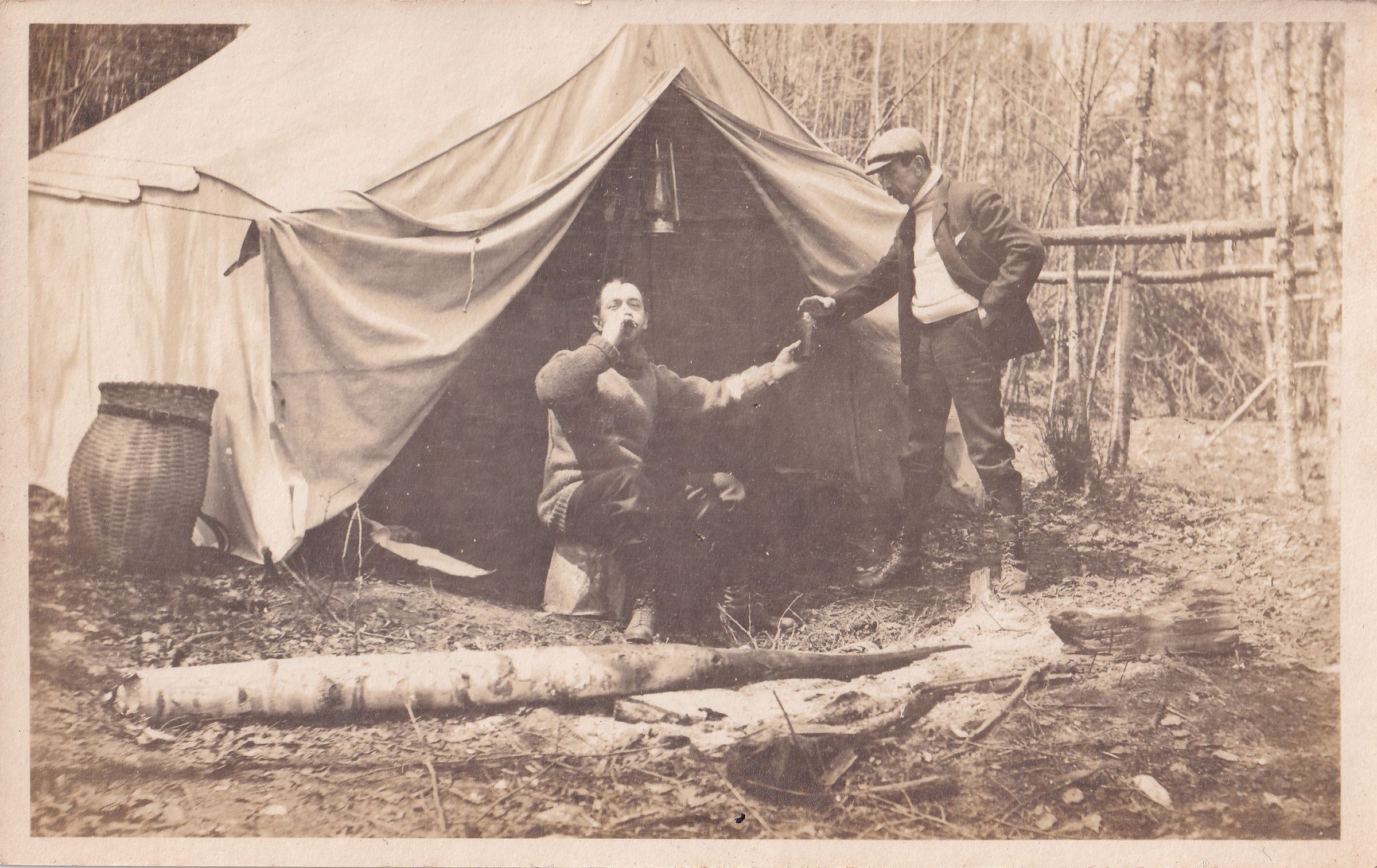 Photograph of two men outside of a camp tent. One man is seated on a bucket and holding his right hand to hist mouth as he passes a bottle to Jack Carrier, standing next to him. There is a pack basket on the ground to the left of the tent and a lantern hangs inside the tent opening. Printed on a blank postcard backing.