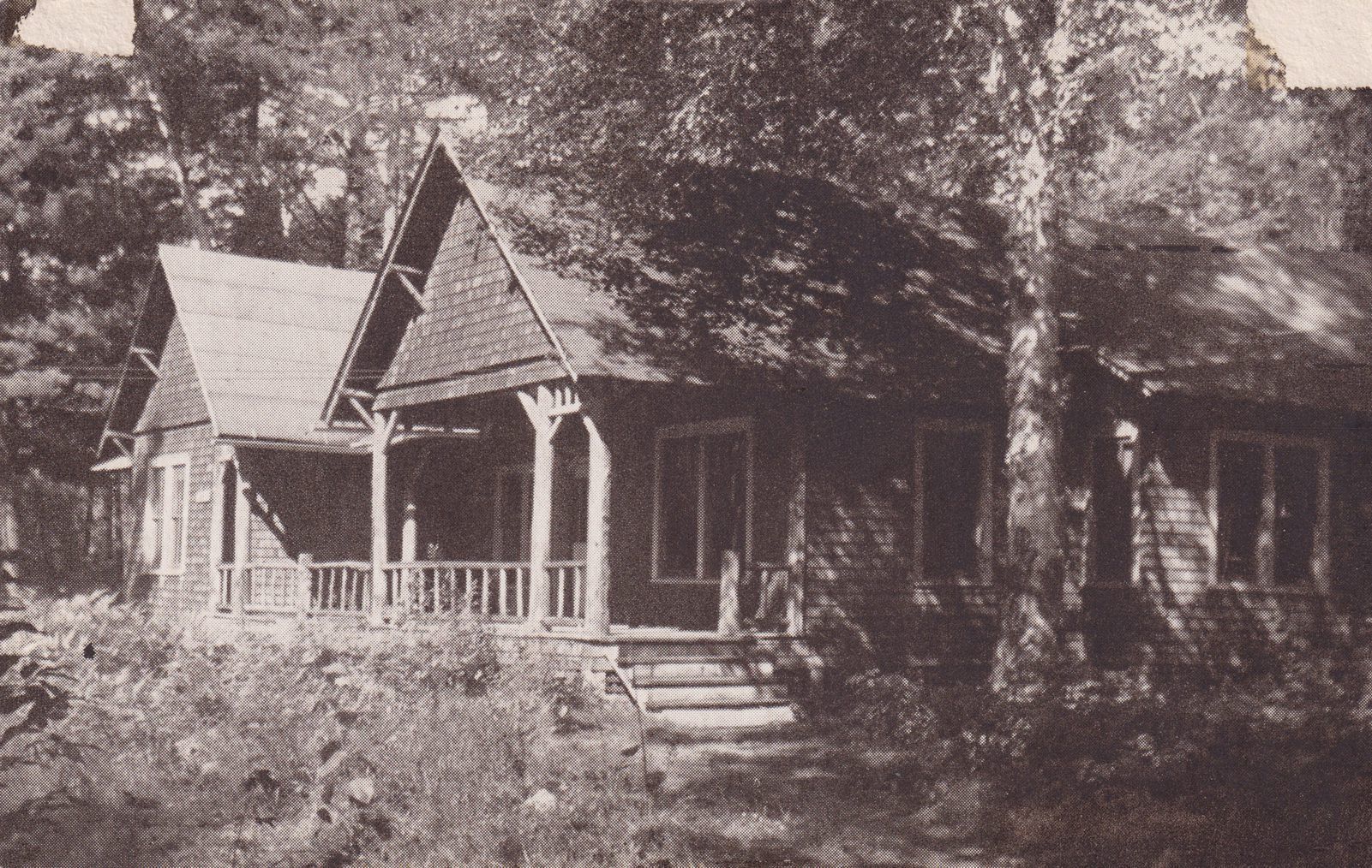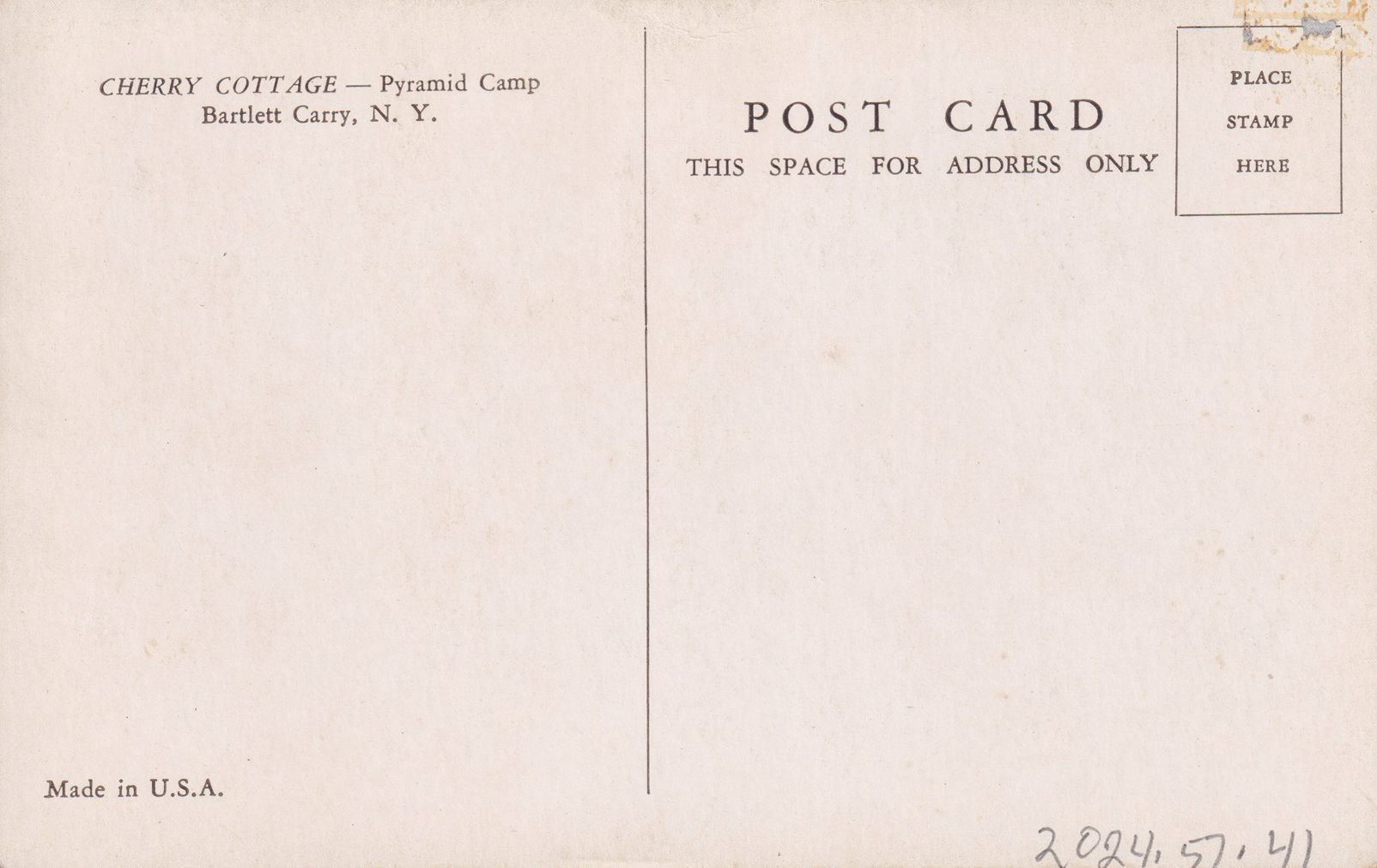 Black-and-White postcard showing the Cherry Cottage at Pyramid Camp (AKA Bartlett Carry Camp). No printer's mark. Unused, divided back.