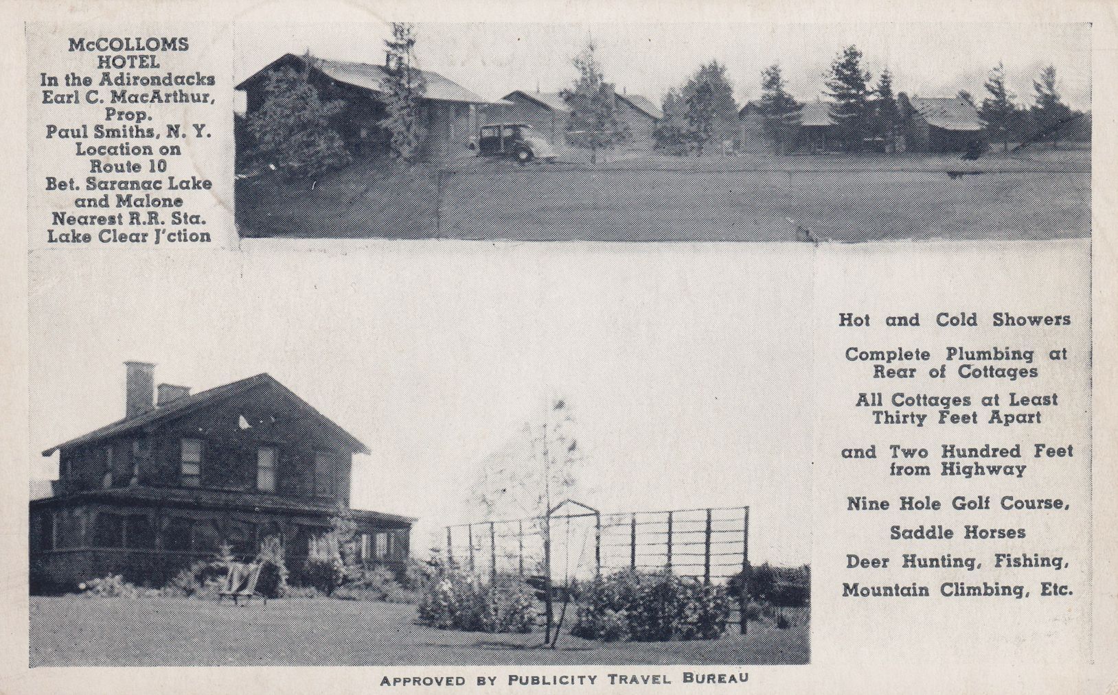 Black-and-White postcard with two images of a hotel and its campus. Printed caption on front reads, "McColloms Hotel," with information on the hotel location and amenities. Printed by the Publicity Travel Bureau, Oswego, NY. Used, divided back, white border, postmarked Paul Smiths, NY, November 2, 1940.
