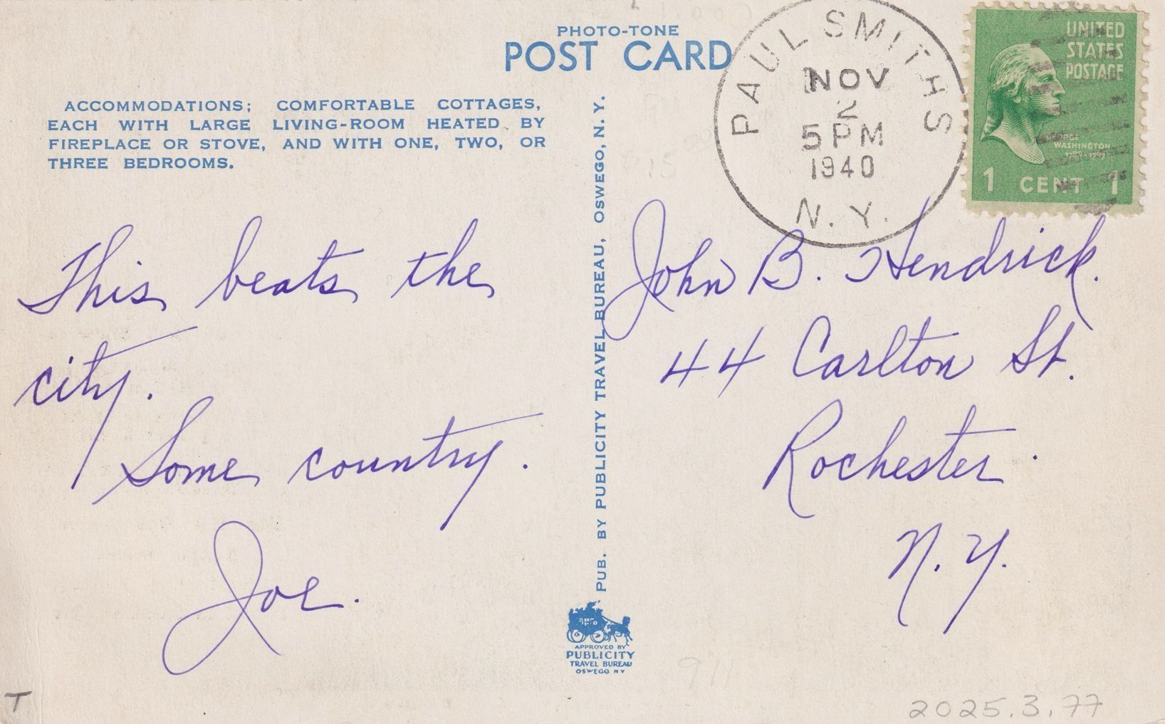 Handwritten message on reverse reads, "This beats the city. Some Country. Joe." Mailed to John B. Hendrick, 44 Carlton St., Rochester, NY.Subject Place
