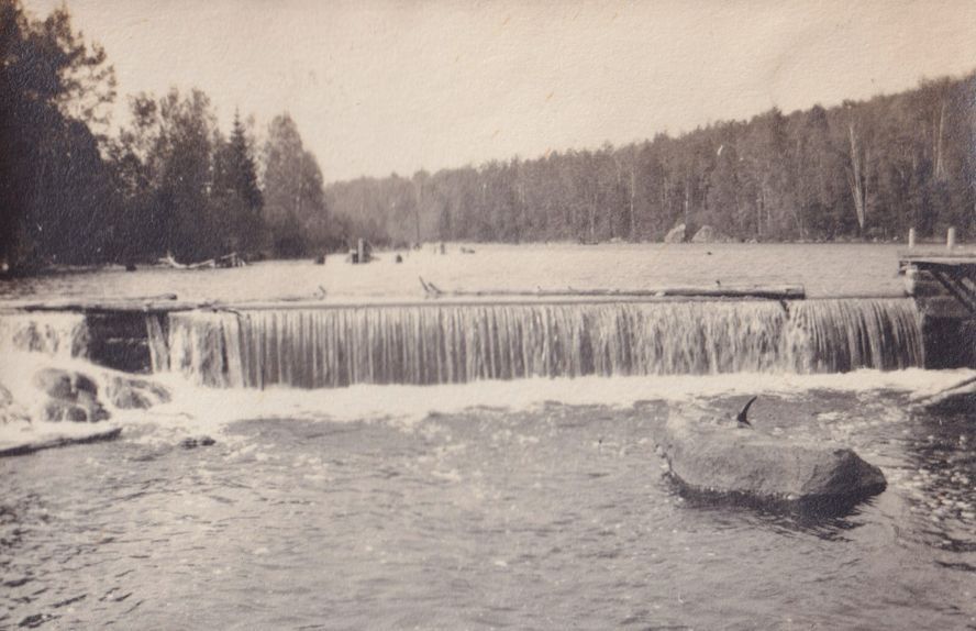 Black-and-white photograph of a river running over a low man made brick wall. The trees lining both shores of the river are visible above the wall.