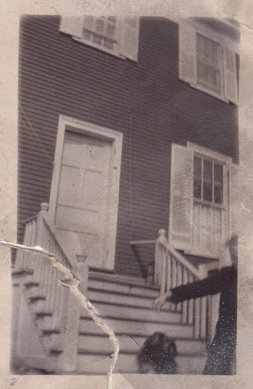 Black-and-White photograph showing the south entry to the Trudeau House (105/118 Main Street). A dog is sitting at the bottom of the steps, and a person's arm is visible gesturing toward the dog. This photograph was found in 2024 underneath interior window trim during construction. The window was one of the windows nearest to where the pictured door was originally located in the building.