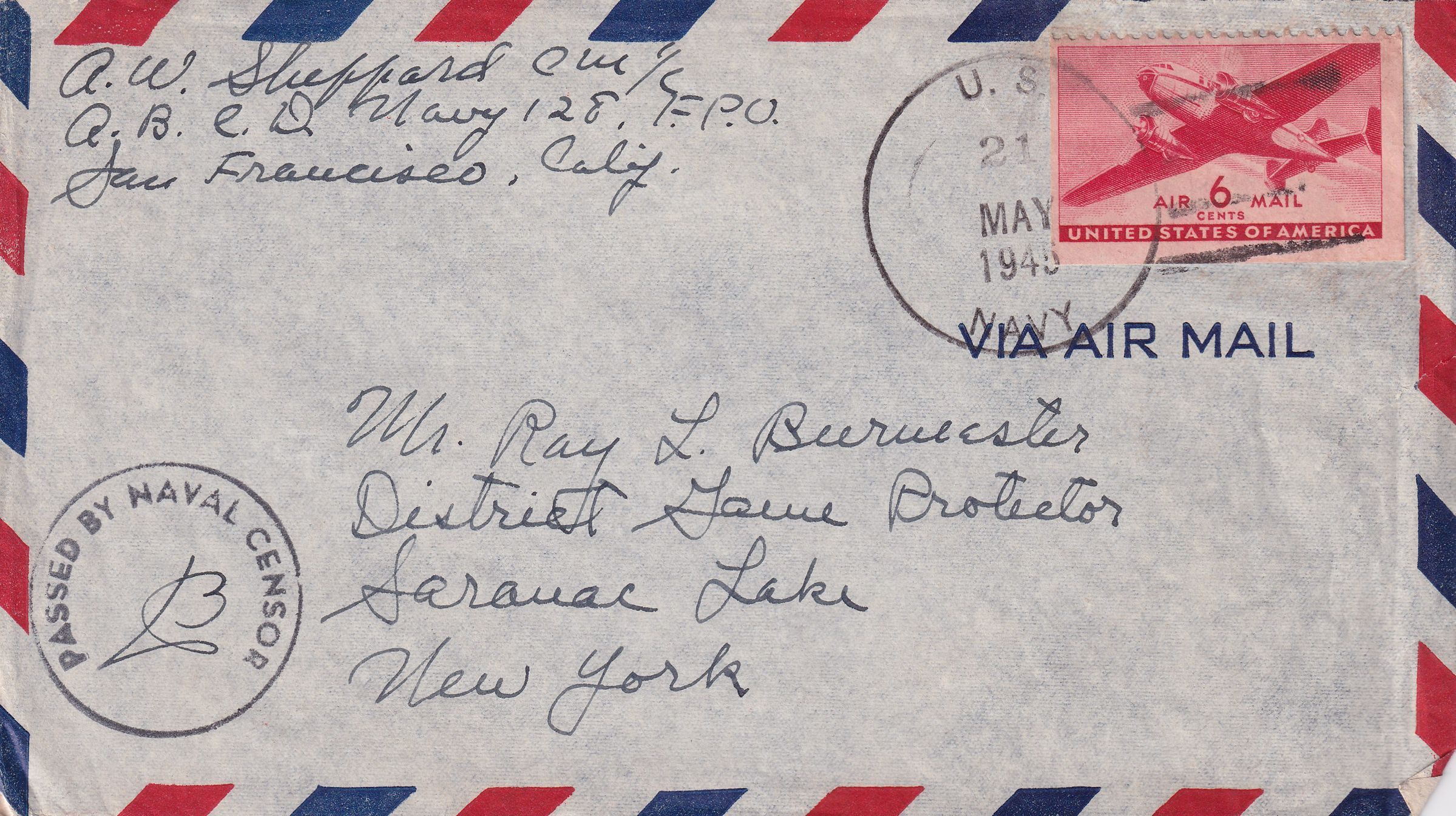 Air Mail envelope used to send postcard 2022.144.70 to Ray Burmaster, District Game Protector, Saranac Lake, NY. Mailed by A. W. Sheppard, San Francisco, CA. Stamped "passed by Naval Censor," and postmarked May 21, 1945, US Navy.Collection
