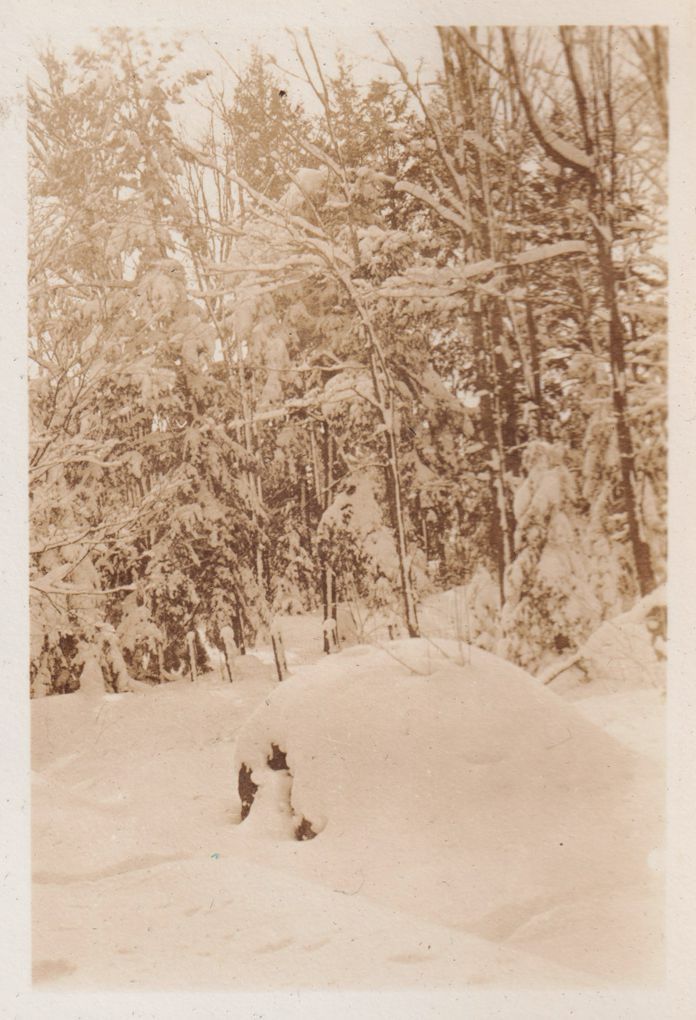Black-and-White photograph of a snowy forest scene. Part of album 2024.21.1, kept by Amy Jones and David Blair Jones c. 1930-1934.