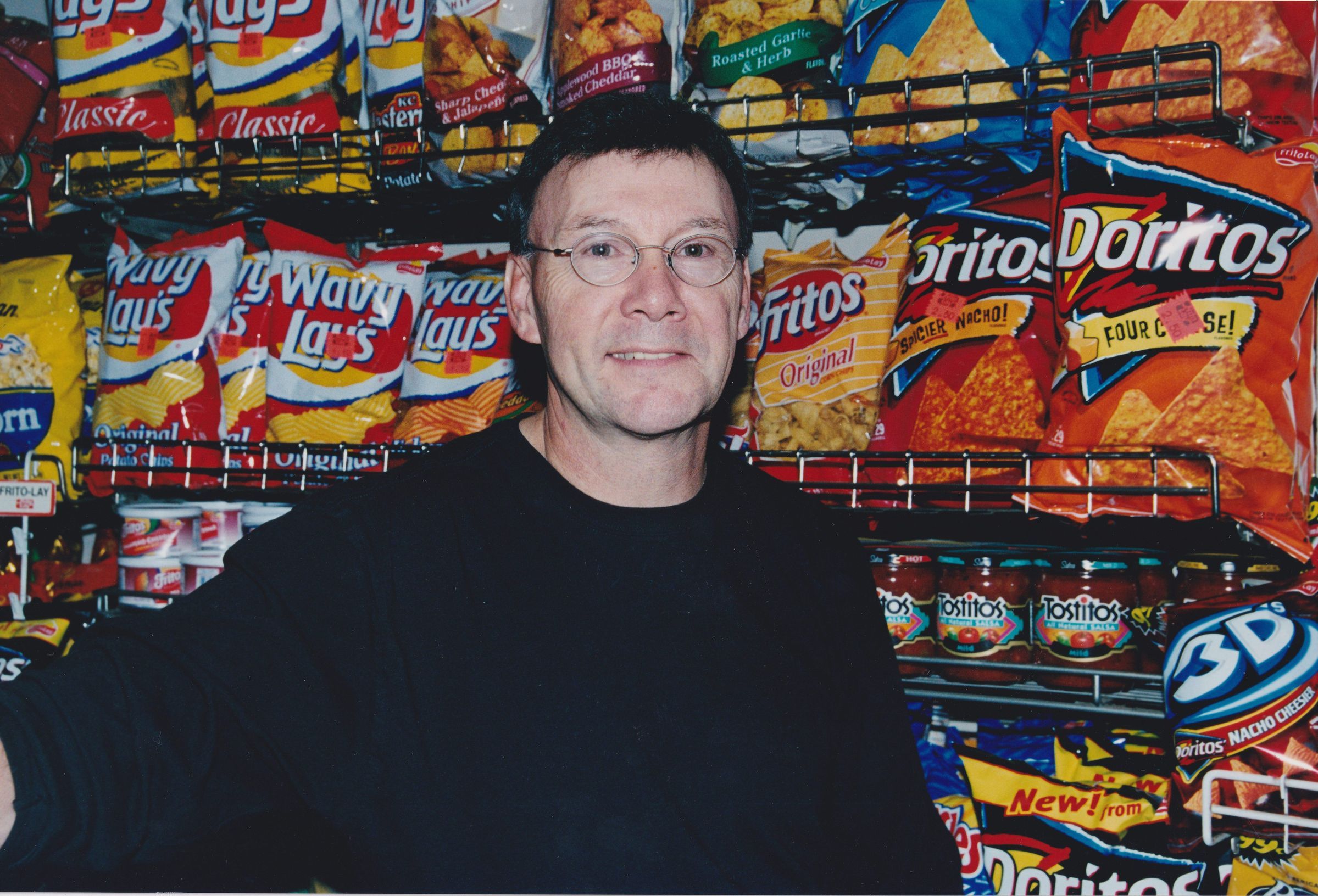 Color photograph of Mike Denis before a wall of bags of potato and toritlla chips inside of his business, E&M Market. Portrait taken by Mary Lou Hanpeter Banks as part of her Soul Proprietor exhibition.