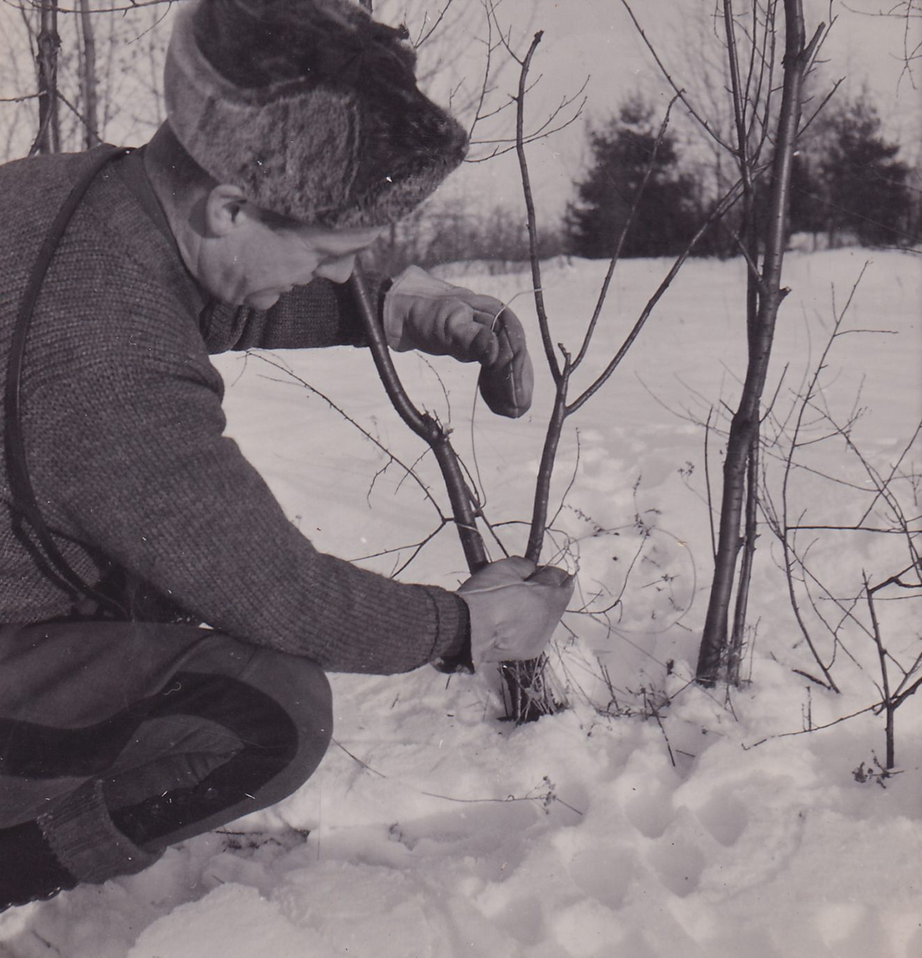 Black-and-White photograph of a man in a game warden uniform examining a tree or bush in the snow.