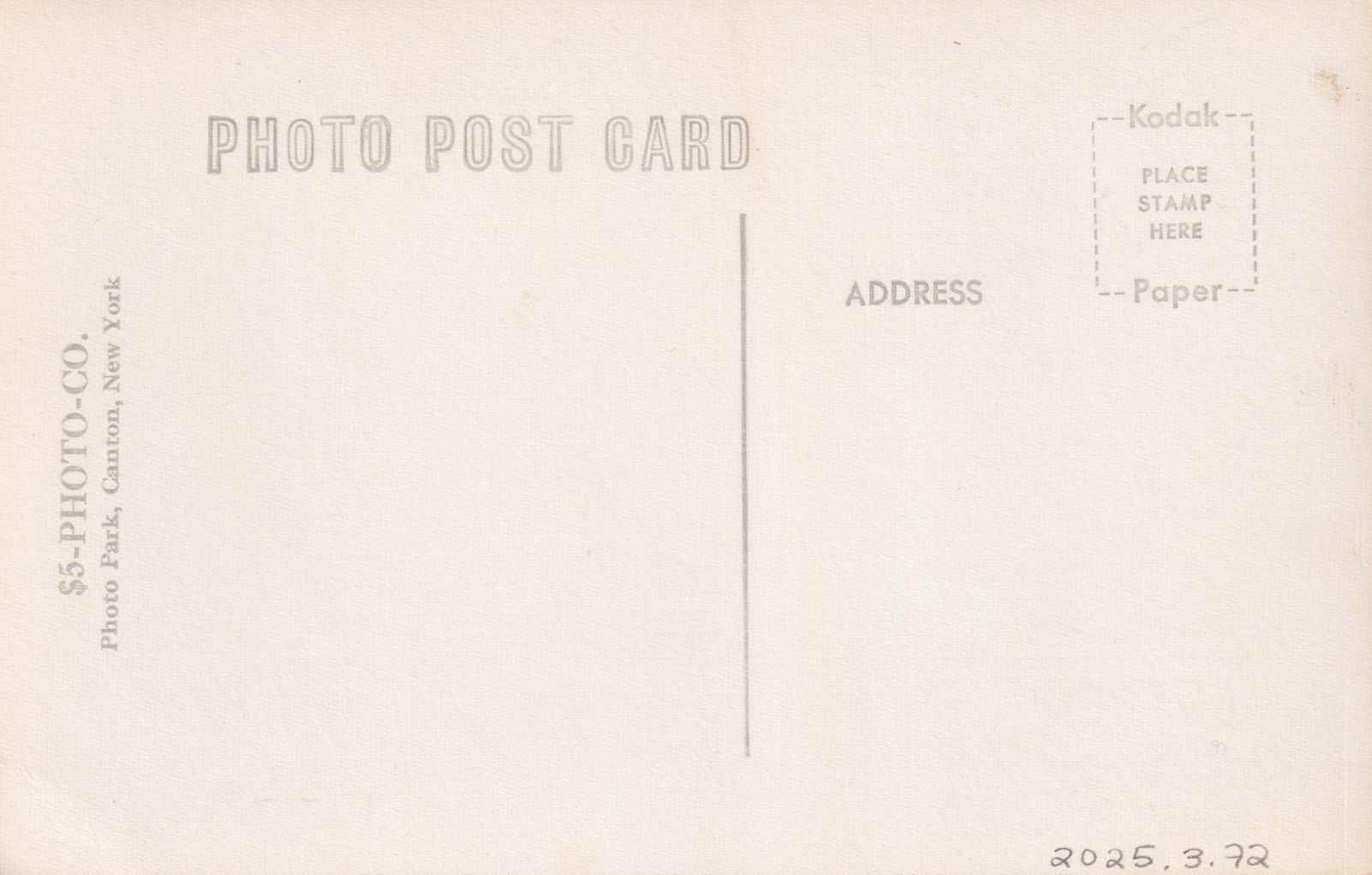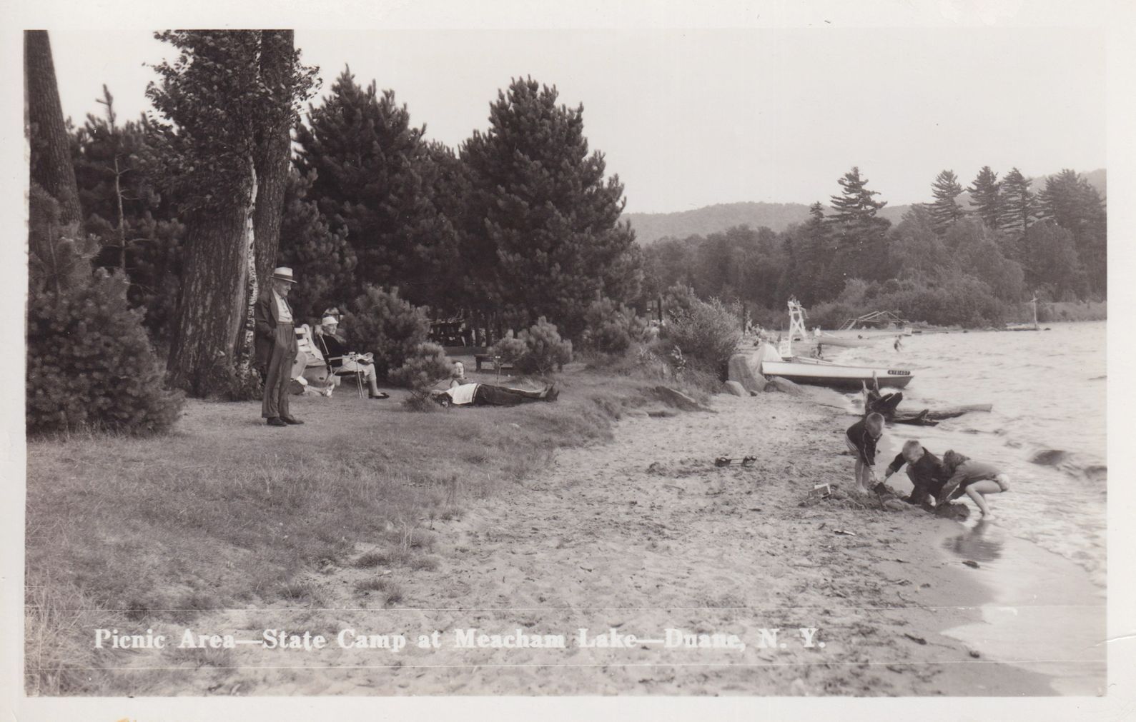Black-and-White photograph postcard showing groups of people along a lakeshore beach. A boat and lifeguard chair can be seen in the distance. Printed caption on front reads, "Picnic Area - State Camp at Meacham Lake - Duane, N. Y." Printed by the $5-Photo-Co., Canton, NY. Unused, divided back, white border.Subject Place