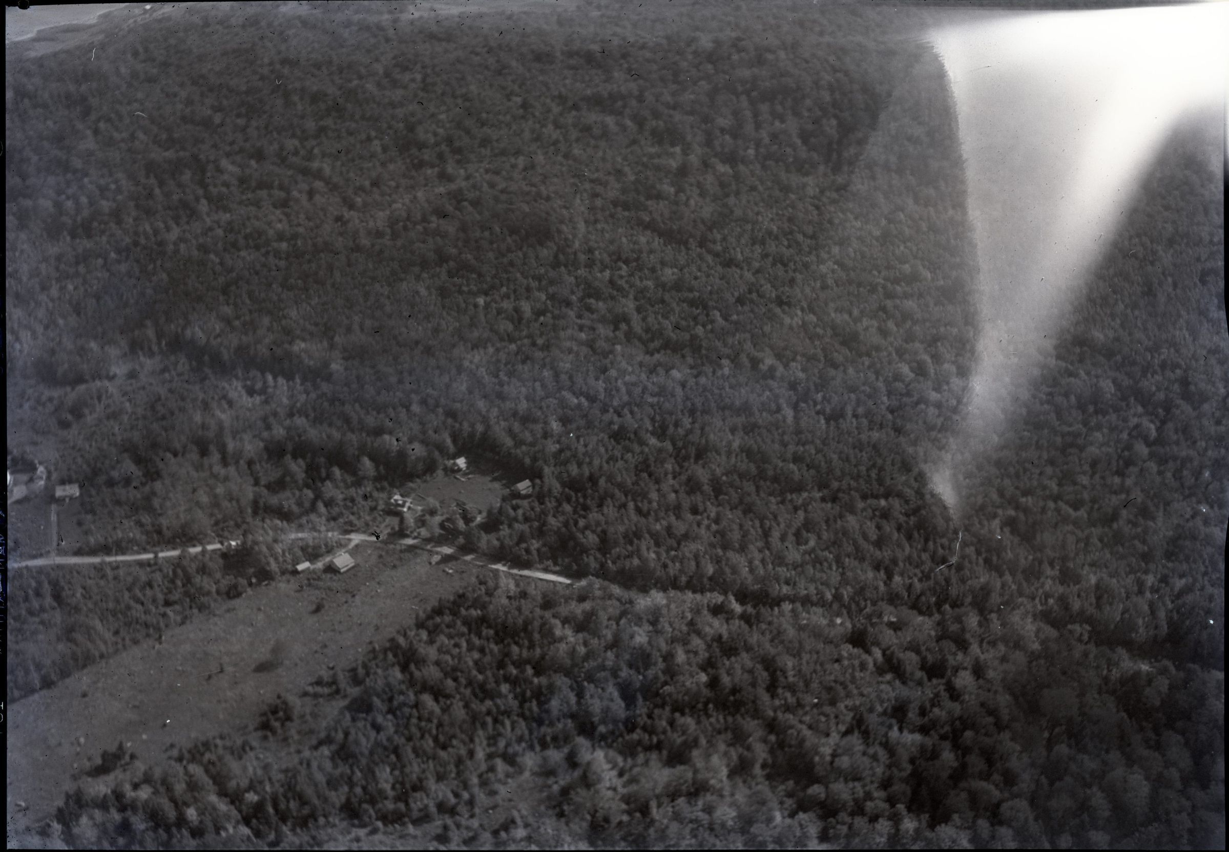 Black-and-White nitrate negative of an aerial view of an unidentified group of houses. Was in an envelope marked, "Camp." Photograph may have been taken by William Kollecker, or for Kollecker's studio.