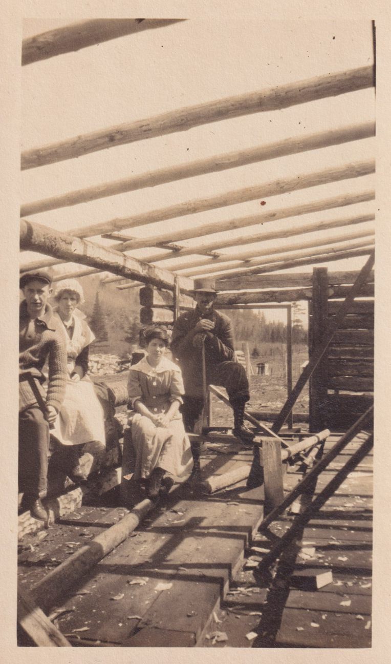 Black-and-White photograph of a group of people under a wooden structure, possibly a partially constructed cabin. The two men are holding tools. The photograph was likely printed by Kollecker's Kodak and Gift Shop.