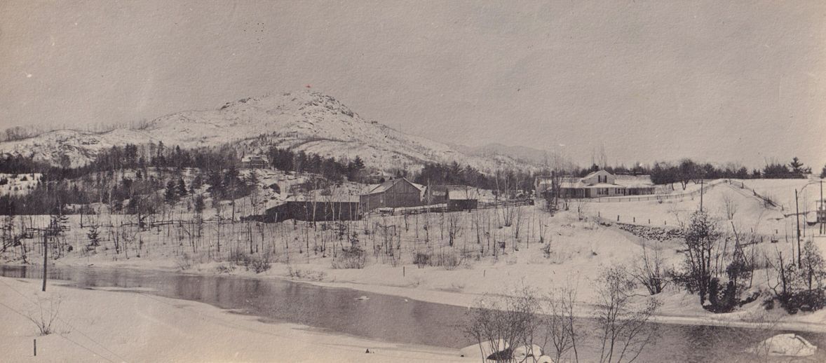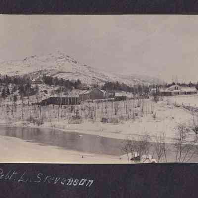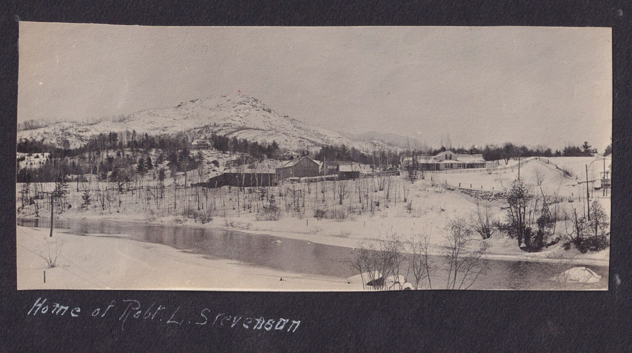 Black-and-white photograph looking across the Saranac River to a snow-covered Stevenson Cottage. Baker Mountain is visible behind the cottage. "Home of Robt. L. Stevenson" is written in white under the photograph.
