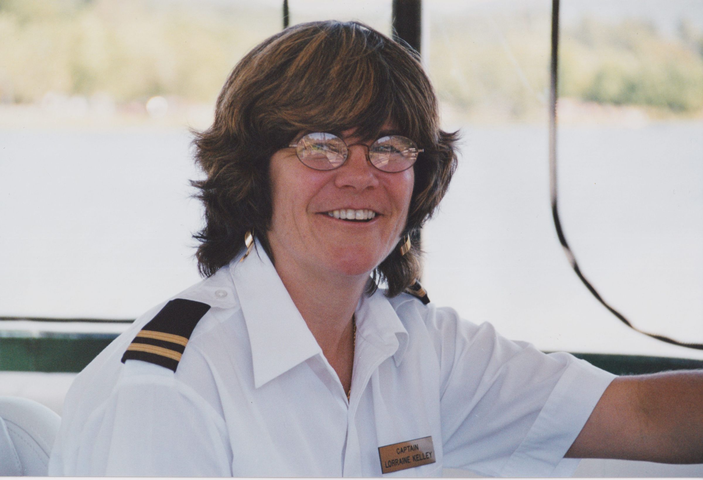 Color photograph of Lorraine Kelley inside of a boat owned by her business, Saranac Lake River Cruise Line. Portrait taken by Mary Lou Hanpeter Banks as part of her Soul Proprietor exhibition.