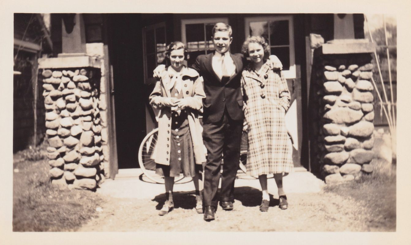 Black-and-White photograph of three young people in front of a house. Was in a Kollecker Kodak & Gift Shop envelope marked, "Geo. Mayre. Thursday May 20 1937." Photograph was developed by Kollecker's Kodak and Gift Shop. Negative is 2024.2.37.5. Same image as 2024.2.38.7.