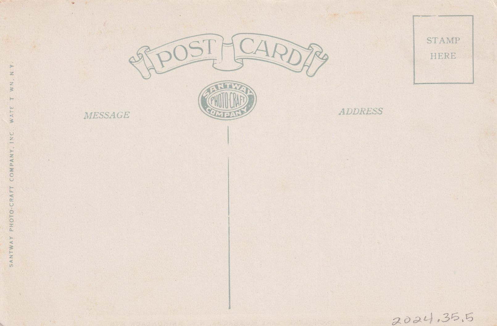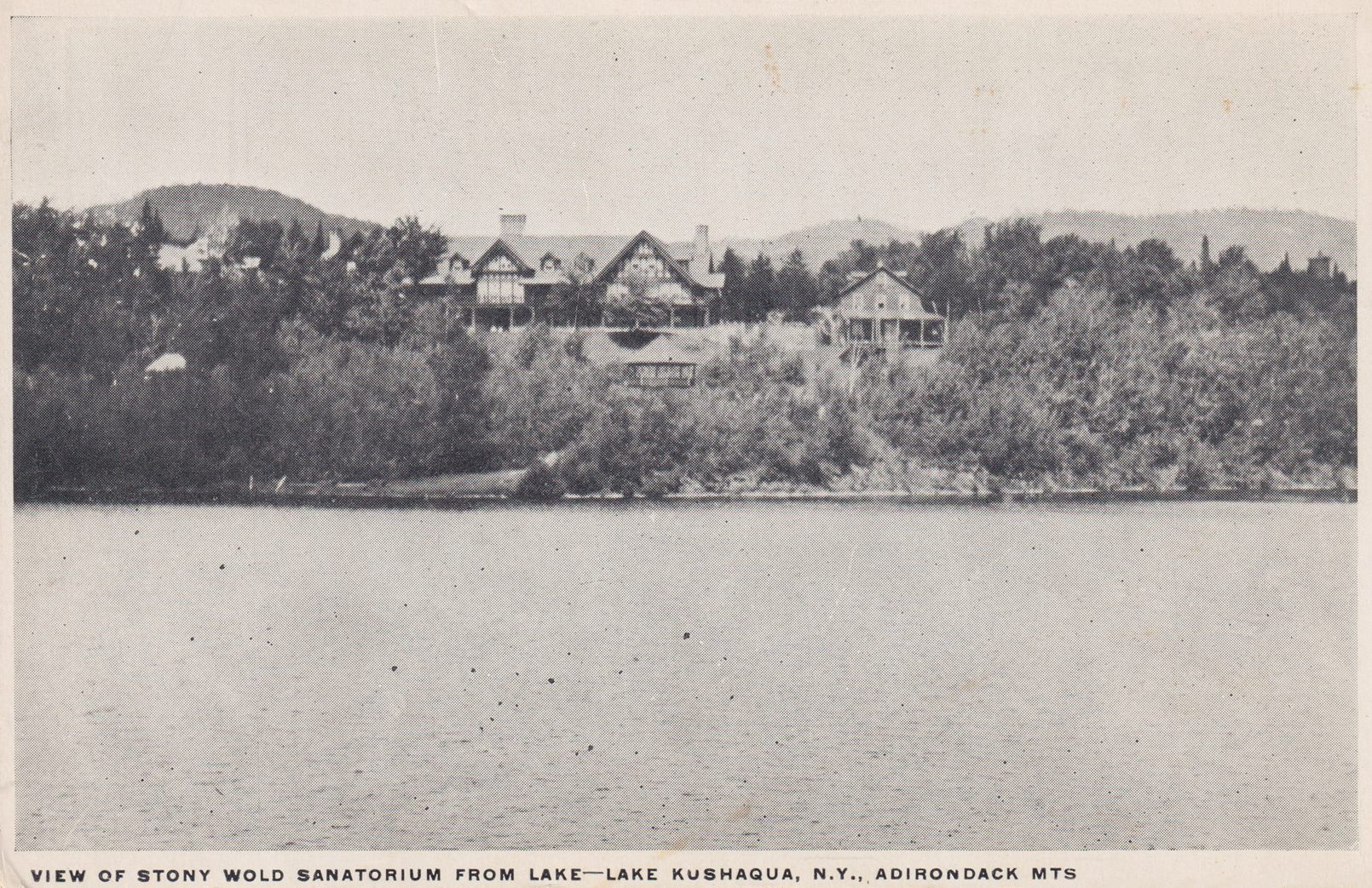 Black-and-White postcard of the view of Stony Wold Sanatorium from Lake Kushaqua. Printed caption on front reads, "View of Stony Wold Sanatorium from Lake--Lake Kushaqua, N. Y., Adirondack Mts." Printed by Santway Photo-Craft Company, Inc. Watertown, NY. Unused, divided back, white border.Subject Place
