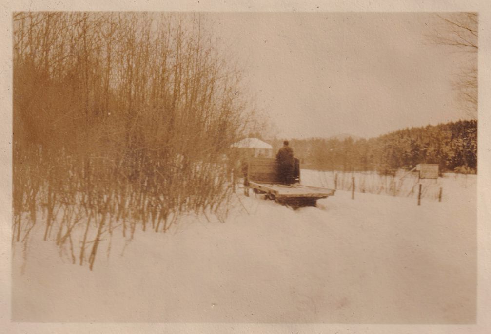 Black-and-White photograph of a man riding through the snow on a horse-drawn sled.