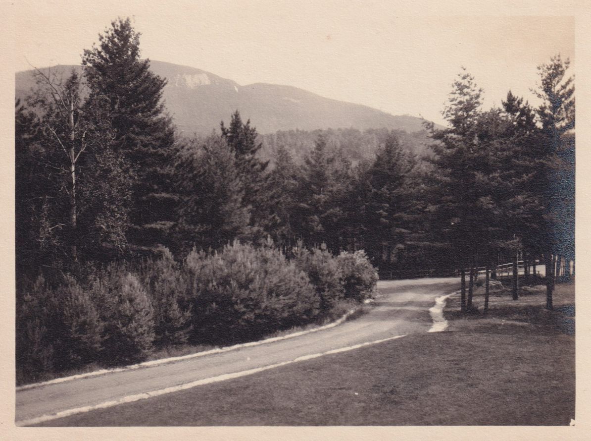 Black-and-White photograph of an unidentified road. A mountain can be seen in the distance. The photograph was likely printed by Kollecker's Kodak and Gift Shop.