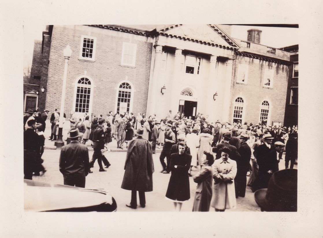 Black and white photograph of many people standing on the sidewalk and in the road in front of the Harrietstown Town Hall.