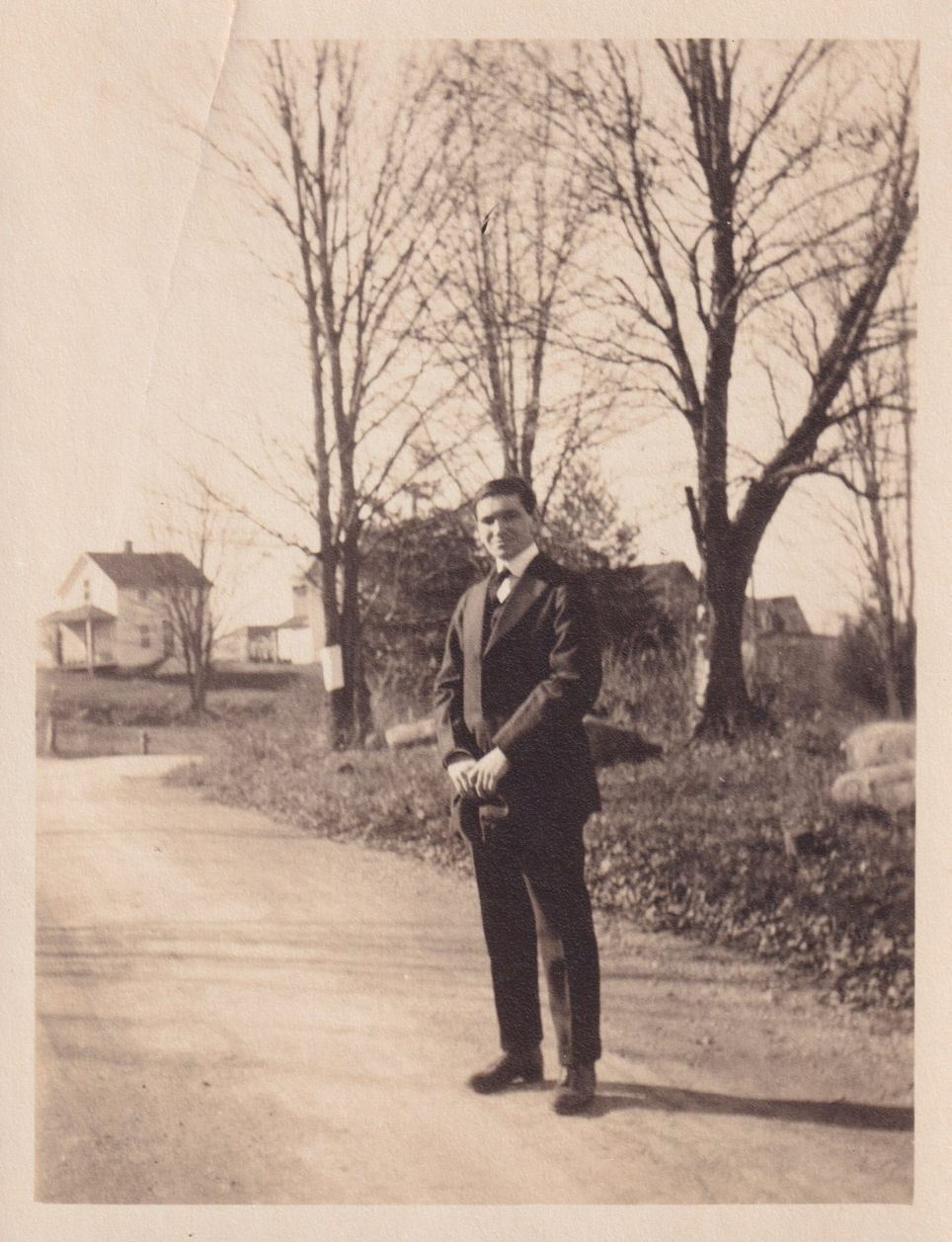 Black-and-White photograph of an unidentified man standing on a road or driveway. He is wearing a suit and holding his hat in his hands. Several buildings are visible in the distance. The photograph was likely printed by Kollecker's Kodak and Gift Shop.