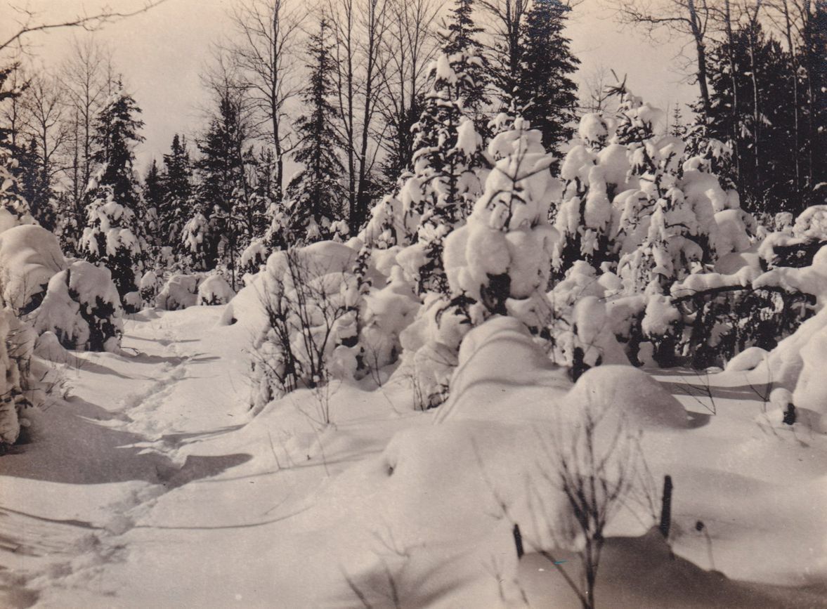 Black-and-White photograph of snowy path through the woods. Footprints can be seen in the snow leading away. The photograph was likely printed by Kollecker's Kodak and Gift Shop.