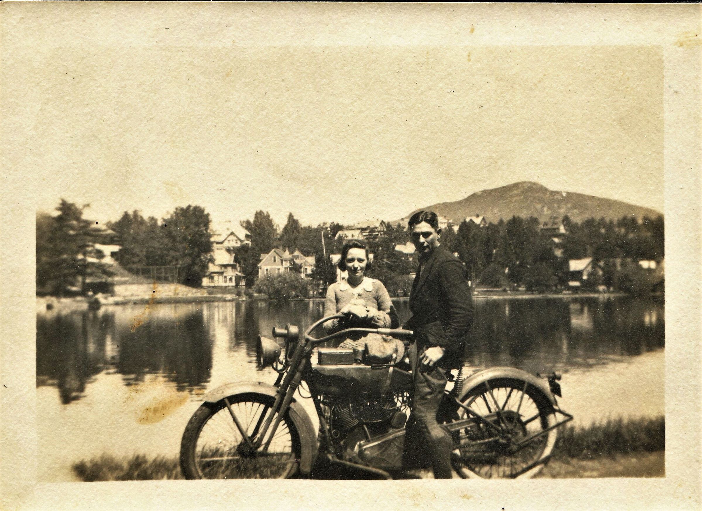 Black and white photograph of Rose Kuech [sometimes Koech] and an unidentified man on a motorcycle by the shore of Lake Flower. Houses can be seen on the other side of the lake.