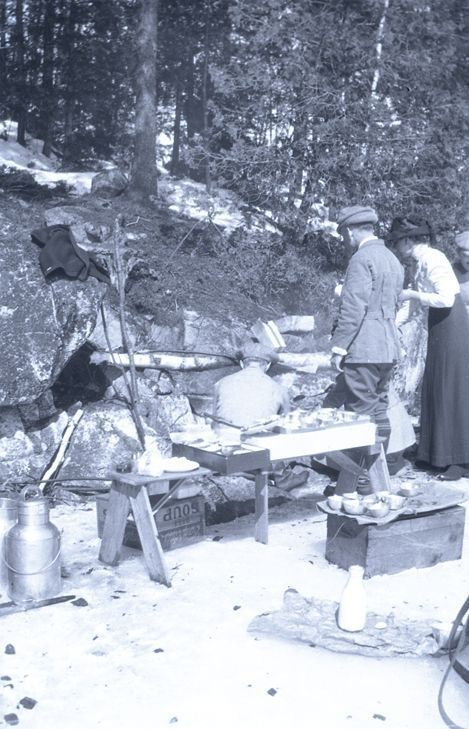 Negative of a group of two men and one woman standing in a forest around what is likely a fire pit. There are various provisions and cups or bowls behind them, including an upside down box that says "Soup" on its side. Most likely taken by Mary Ives Baldwin. This item is not fully cataloged but has been uploaded so the image is publicly available; if you would like us to prioritize cataloging this item, please contact the HSL Collections team.