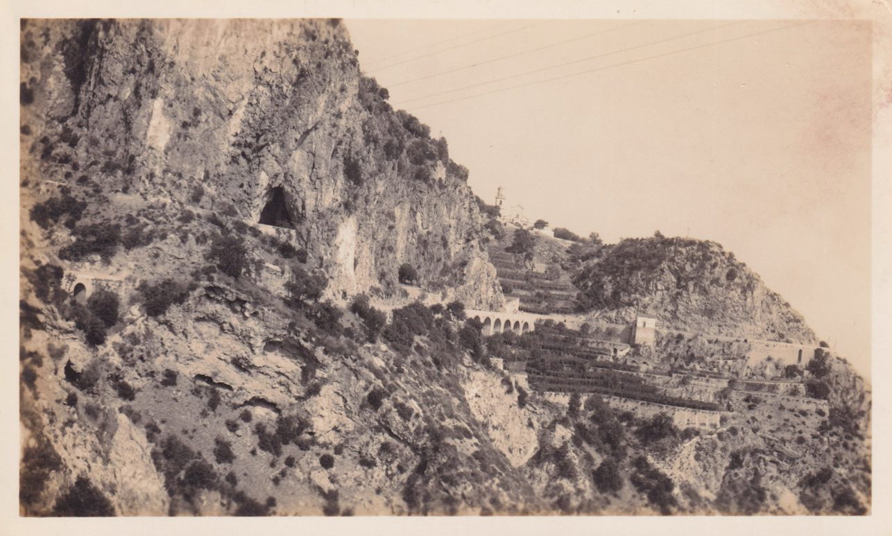 Black-and-White photograph of ruins on a hillside. The photograph was likely taken by a person on vacation in Italy and printed by Kollecker's Kodak and Gift Shop.