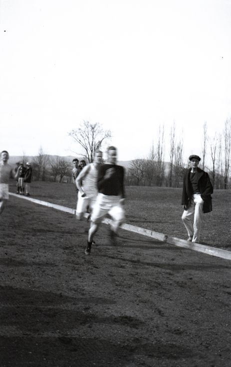 Negative of runners in a track race. There are three runners in frame and one line of spectators at the side of the dirt track. Most likely taken by Mary Ives Baldwin. This item is not fully cataloged but has been uploaded so the image is publicly available; if you would like us to prioritize cataloging this item, please contact the HSL Collections team.