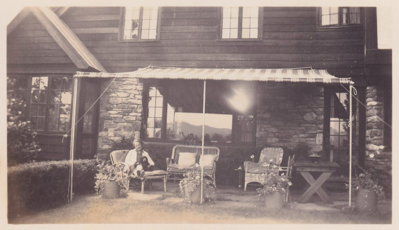 Black-and-White photograph of an unidentified woman sitting on a lounge chair outdoors under an awning at 75 Glenwood [147]. She has a dog with her on the chair. The photograph was likely printed by Kollecker's Kodak and Gift Shop.