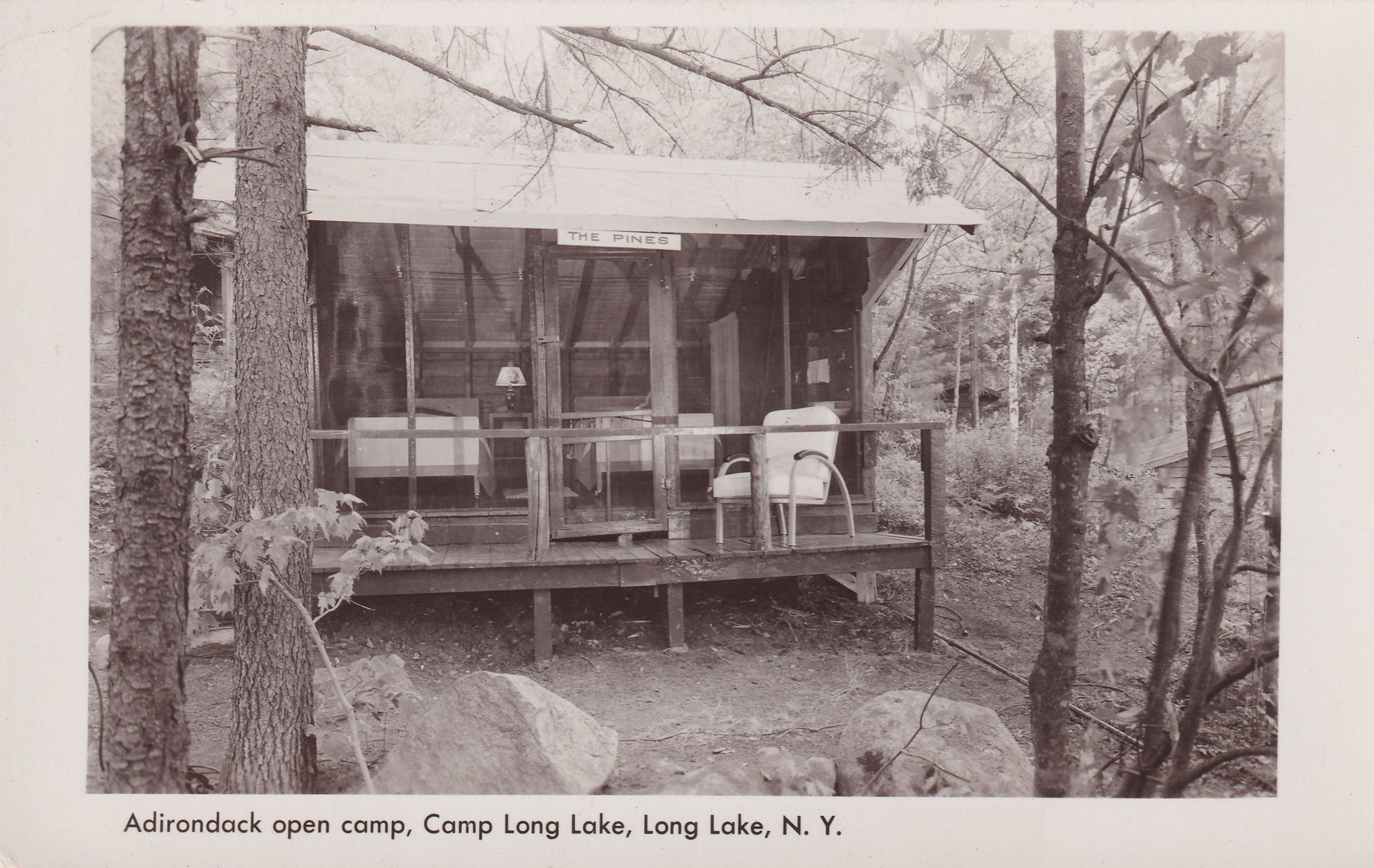Black-and-White photograph postcard showing a small cabin with a porch. Printed caption on front reads, “Adirondack Open Camp, Camp Long Lake, Long Lake, N. Y.” Unused, divided back, white border.Collection