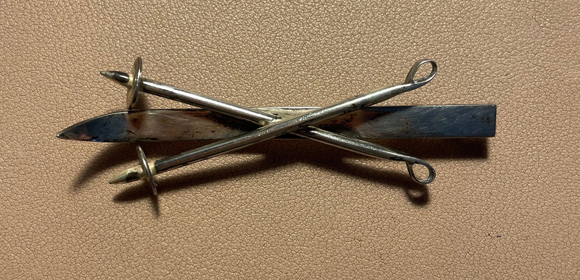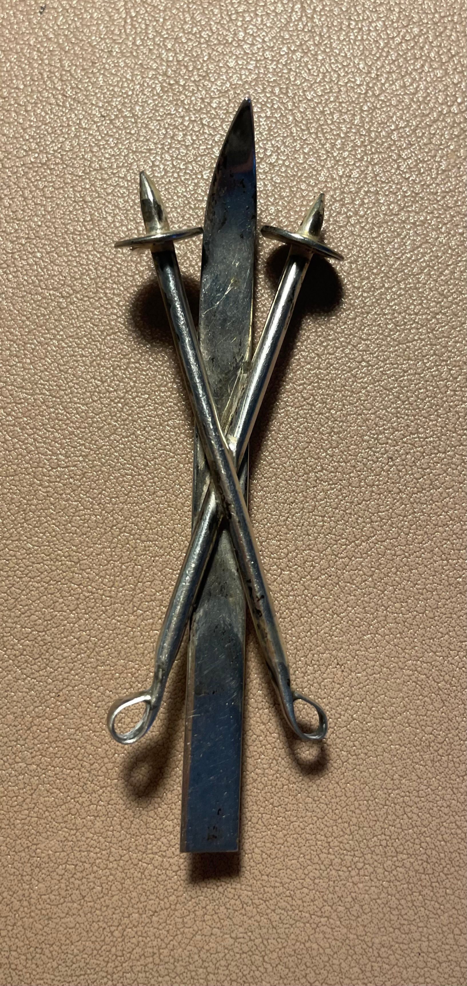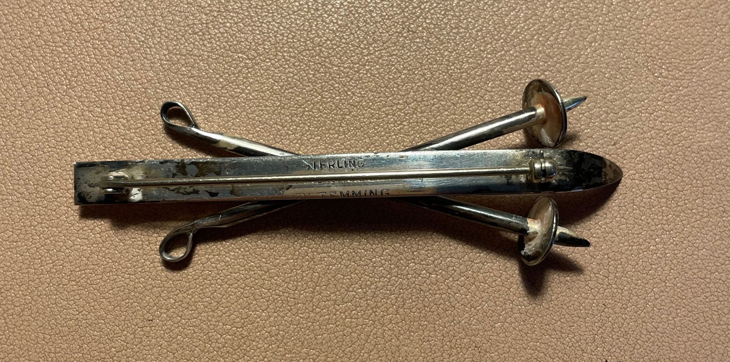 Sterling silver pin with a single ski and crossed ski poles. Stamped on reverse, "Sterling, handwrought by Temming." Bar pin backing.
