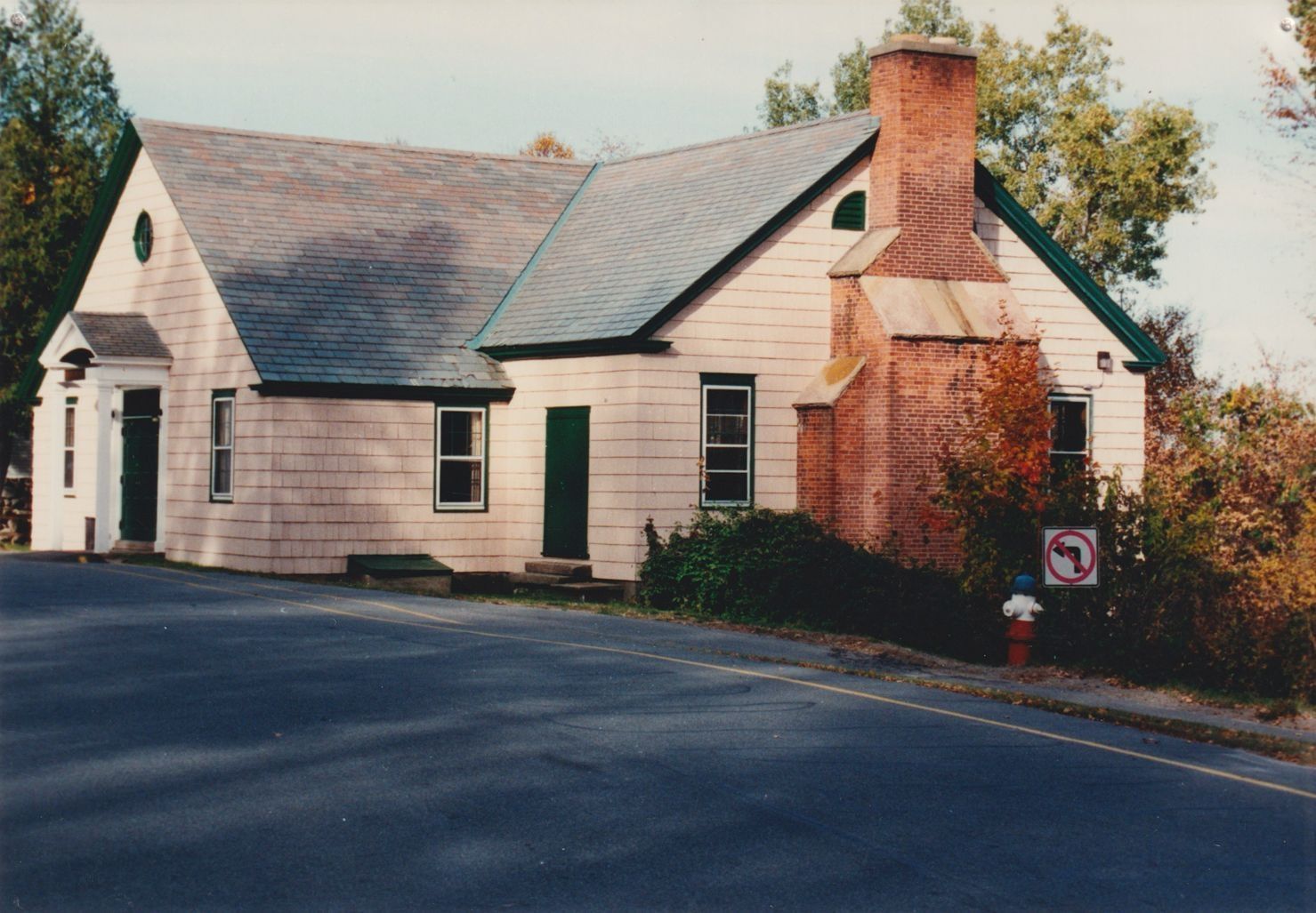 Color photograph of a building surrounded by fall foliage. The building was the Recreation Pavilion when it was part of the Trudeau Sanatorium, but at the time of the photograph it was part of the American Management Association grounds.