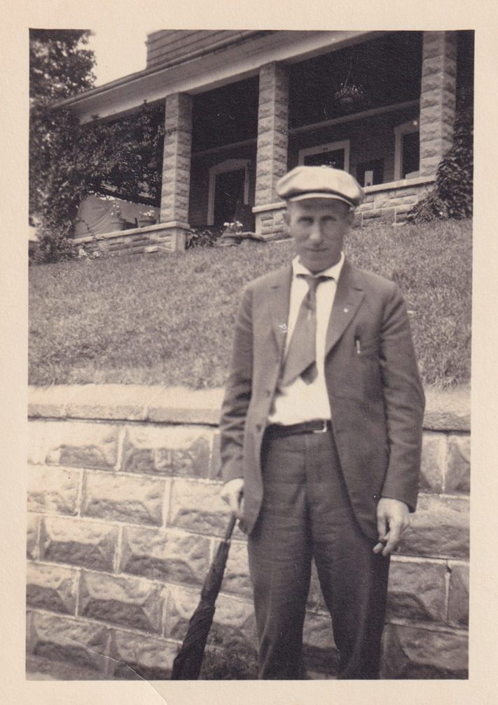 Black-and-White photograph of a man standing on the sidewalk in front of an unidentified house. There is a concrete retaining wall behind him. The photograph was likely printed by Kollecker's Kodak and Gift Shop.