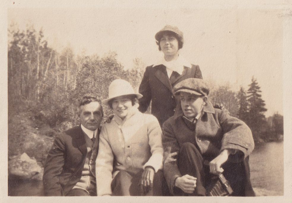 Black-and-white photograph of two women and two men together on a boat. Three of them are sitting while one woman stands behind them with her hands on two of their shoulders. There is a wooded lake shore visible behind them.
