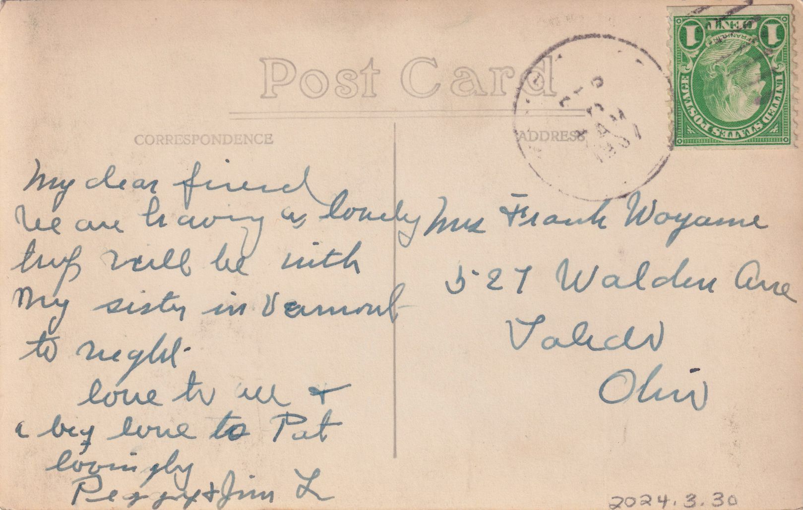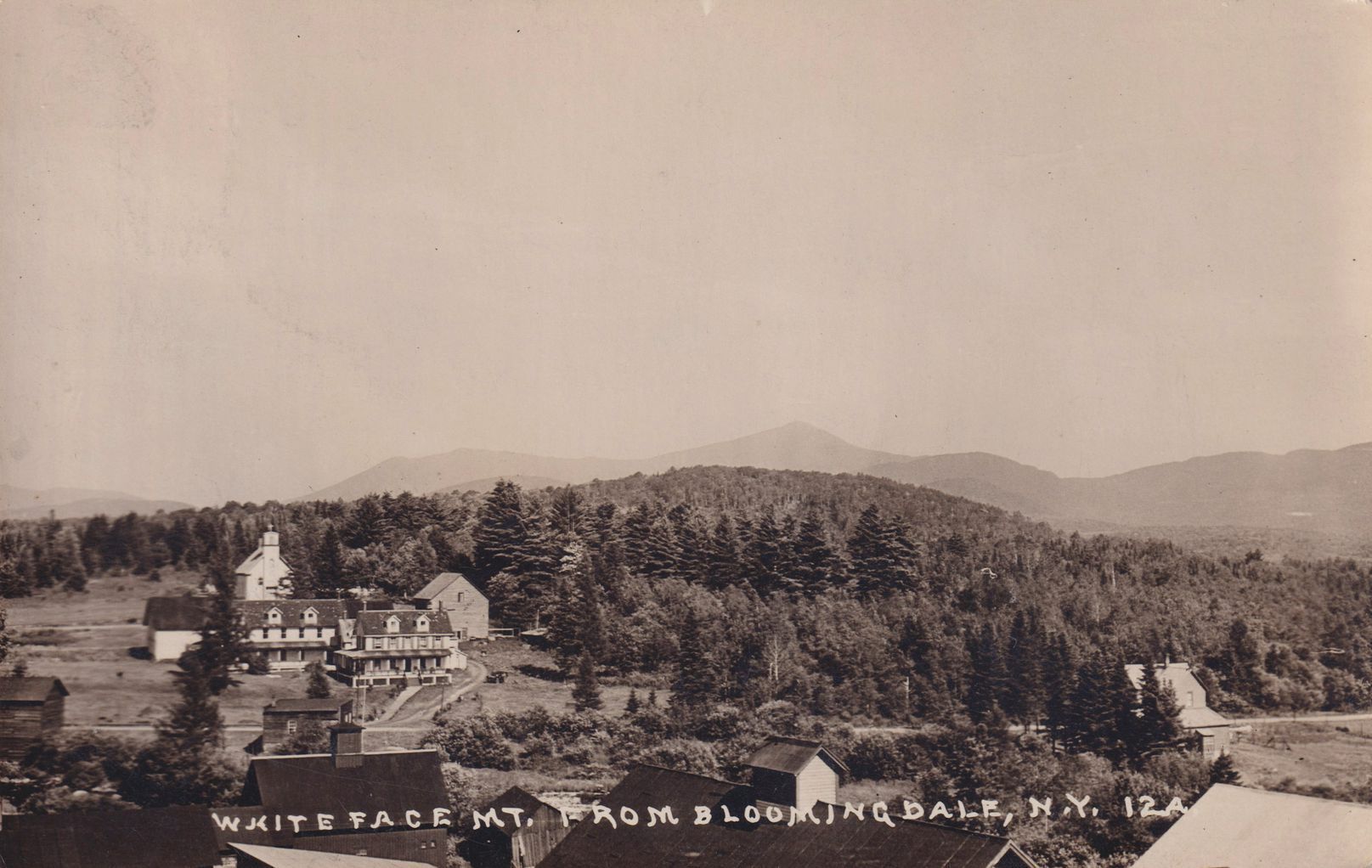 Black-and-White photograph postcard showing an elevated view of a town, with mountains in the distance. Printed caption on front reads, "Whiteface Mt. from Bloomingdale, N.Y." No photographer's mark. Used, divided back, postmark illegible. Handwritten message on back reads, "My dear friend, We are having a lovely trip will be with my sister in Vermont tonight. Love to all and big love to Pat. Lovingly, Peggy & Jim L." Mailed to Mrs. Frank Woyame [?], 527 Walden Ave., Toledo, Ohio.Subject Place