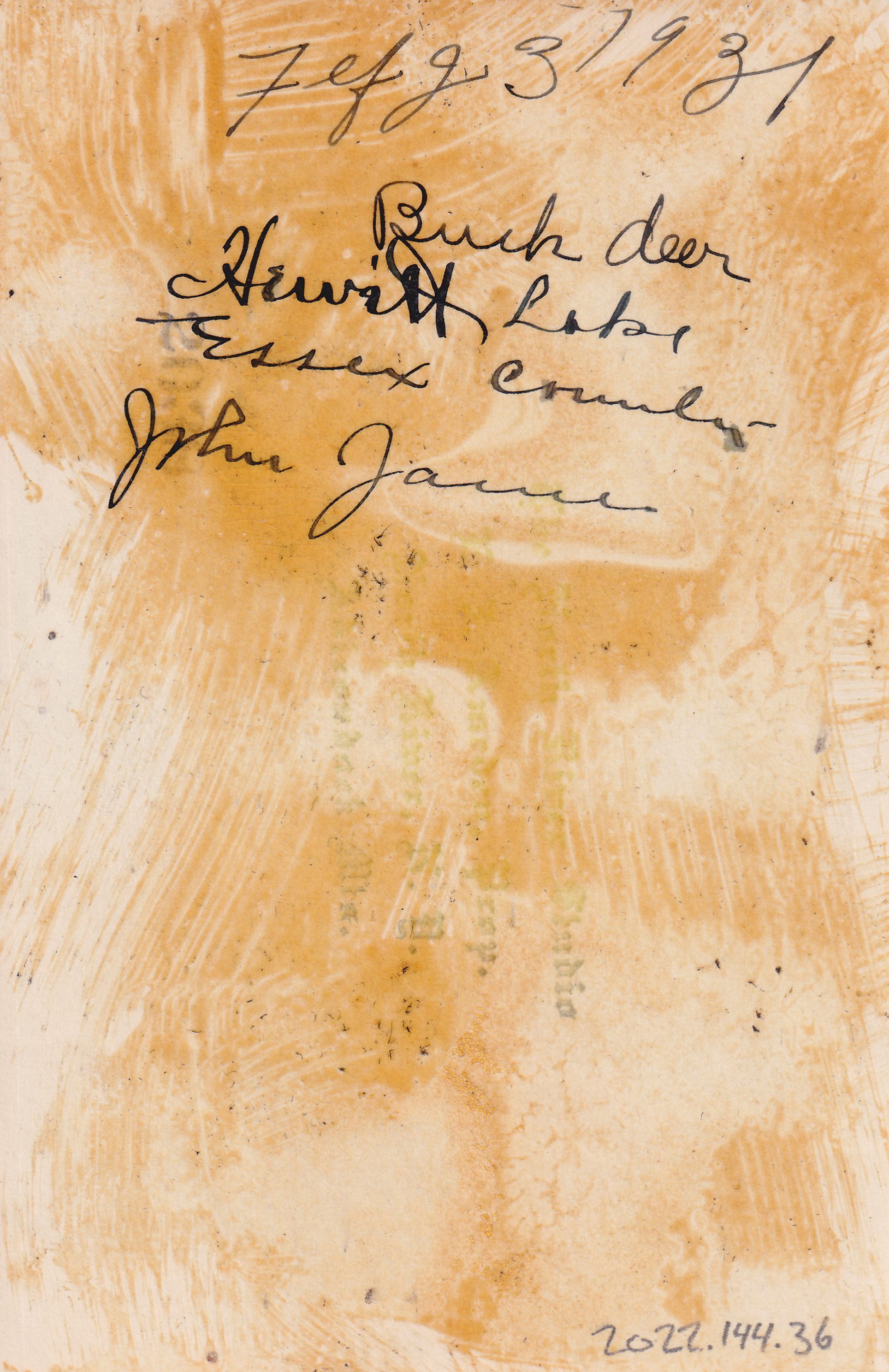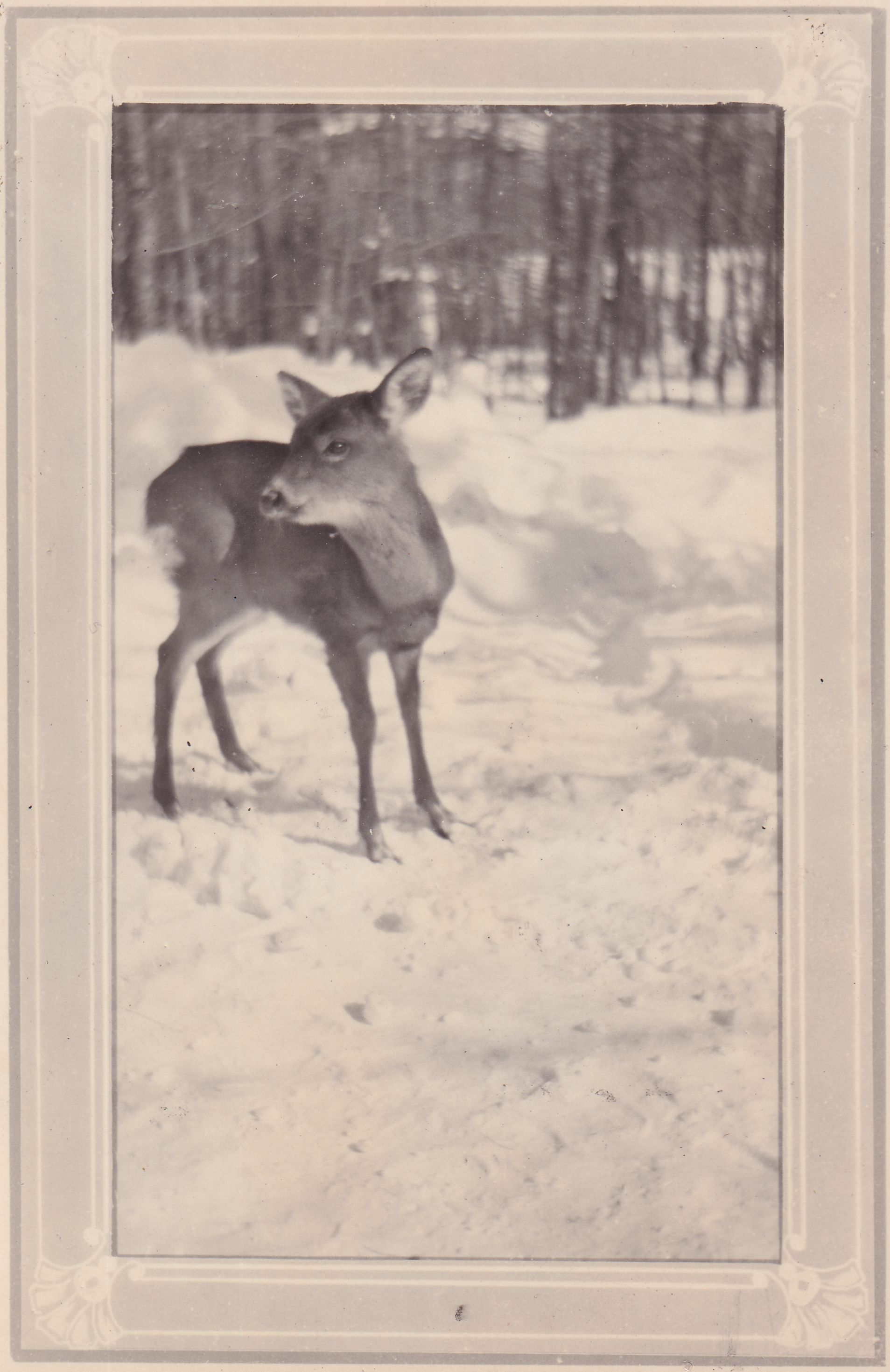 Black-and-White photograph of a fawn standing in the snow. Handwritten caption on back reads, "Feb 23, 1931. Buck deer, Hewitt Lake, Essex County, John James [?]." Print has a decorative printed border.