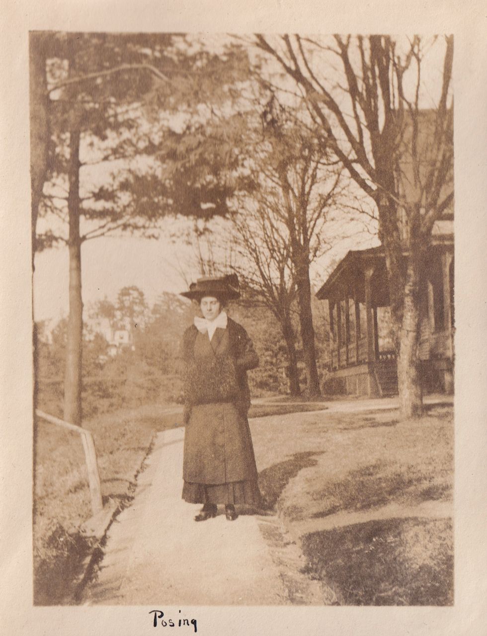 Black-and-white photograph of a woman standing on a paved walkway leading up to a building with a large porch. She is wearing a large hat and bow at her neck. "Posing" is written in ink beneath the photograph.