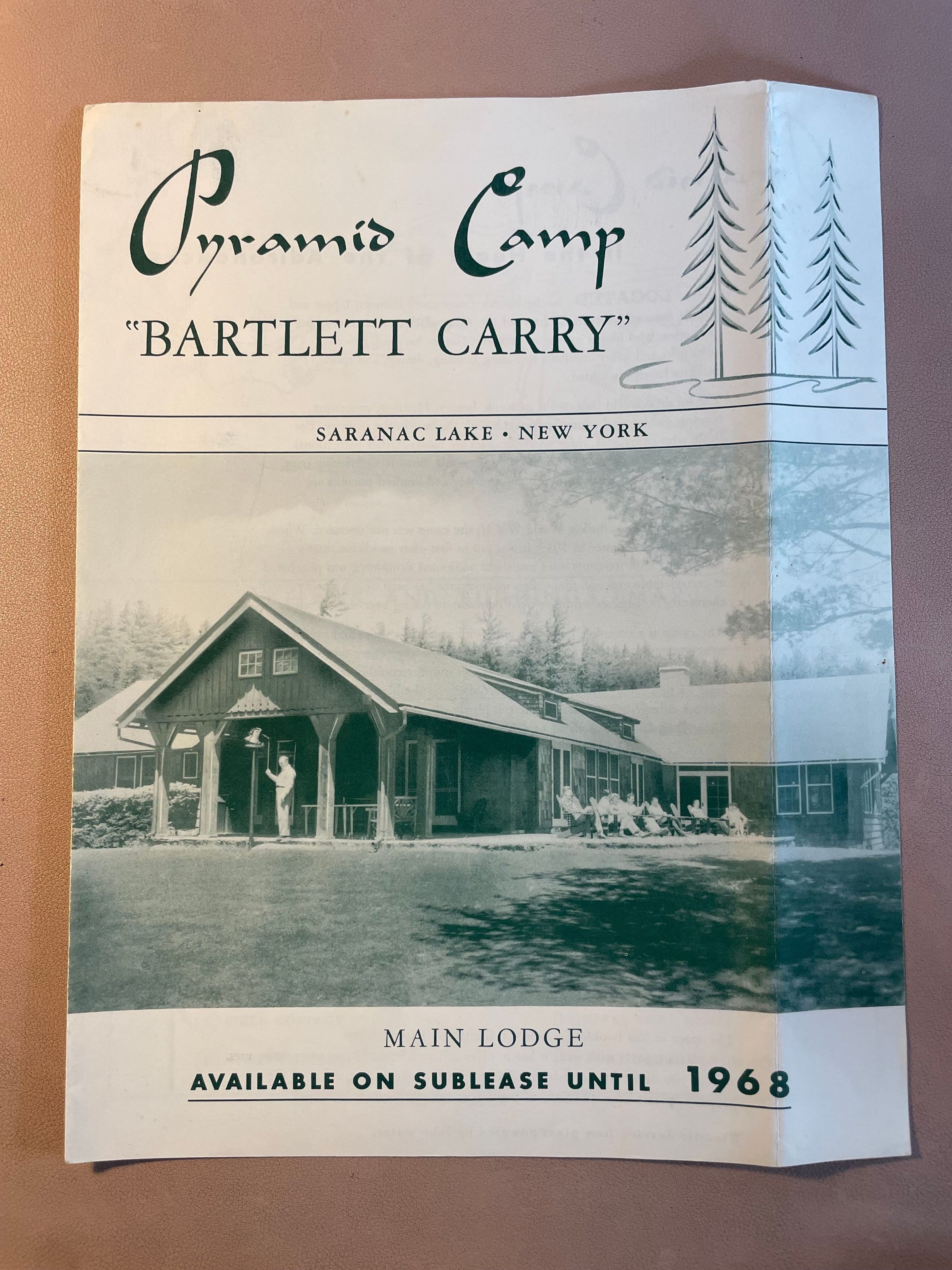 Large pamphlet advertising lease availability for Pyramid Camp (Bartlett Carry Club). Includes information on club history, amenities, buildings, and more. Has photographs and maps. Notes that the camp is available for sub-lease through 1968.Lexicon