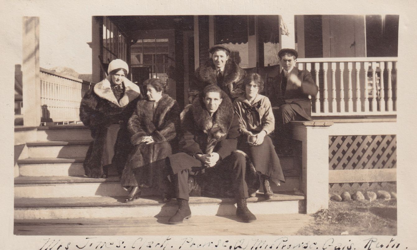 Black-and-white photograph of four women and three men sitting together on the front steps of a cure cottage, most wearing fur jackets. "Mrs Jones, Clark, Prowse (2) Mrs Prowse, Gais, Ruth" is written in ink along the bottom of the photograph.
