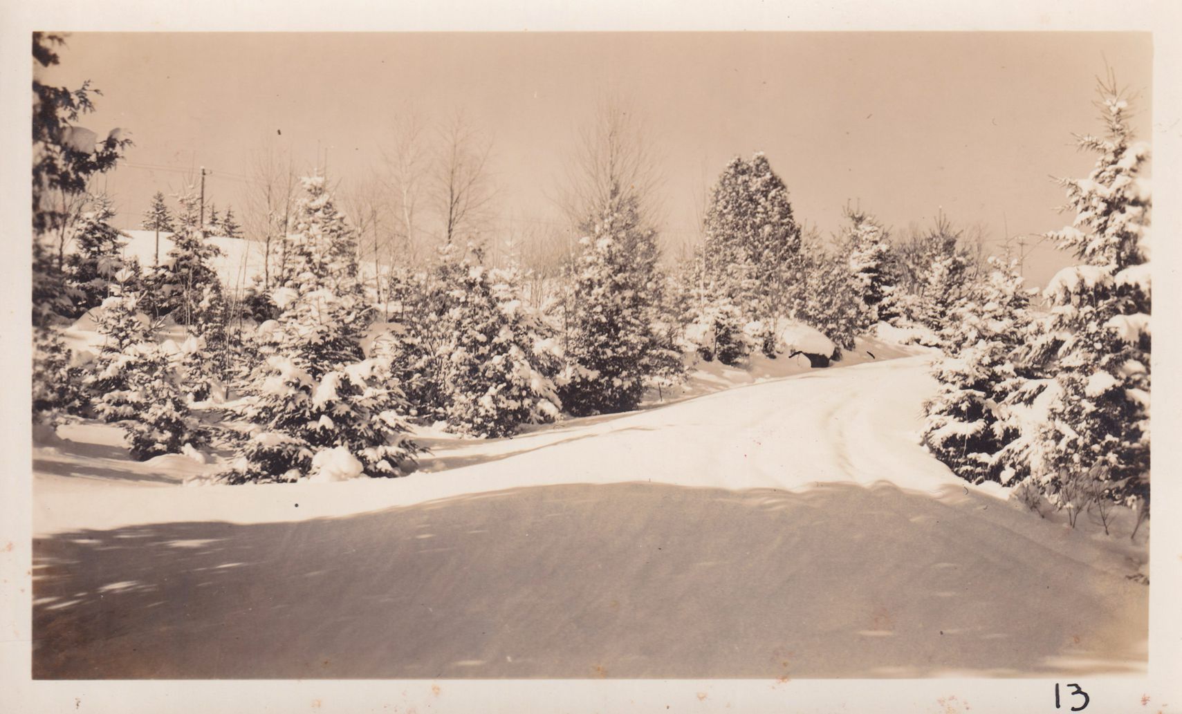 Black-and-White photograph of a snowy road lined with evergreen trees. "13" is written in pen in the bottom right corner. The photograph was likely printed by Kollecker's Kodak and Gift Shop.