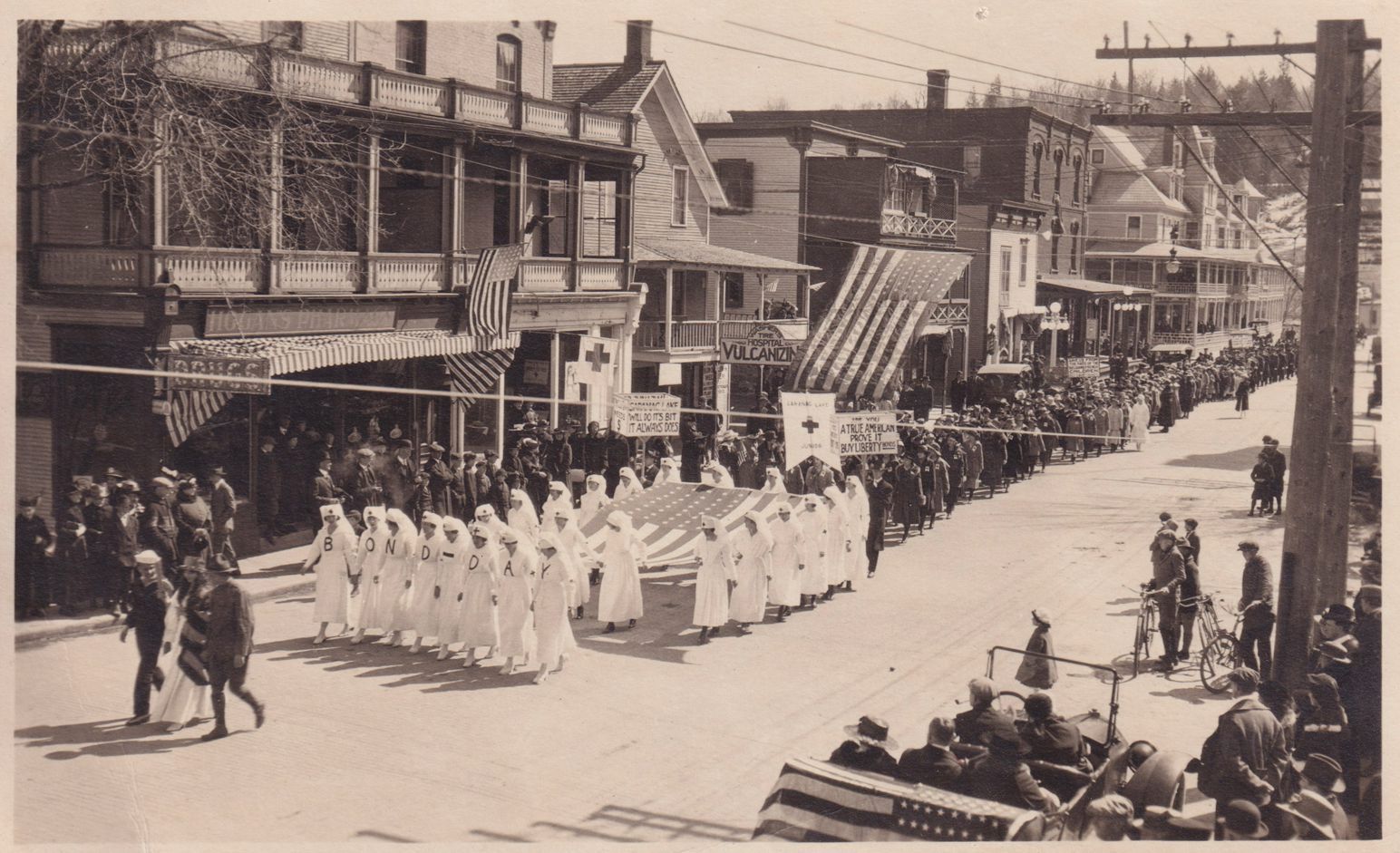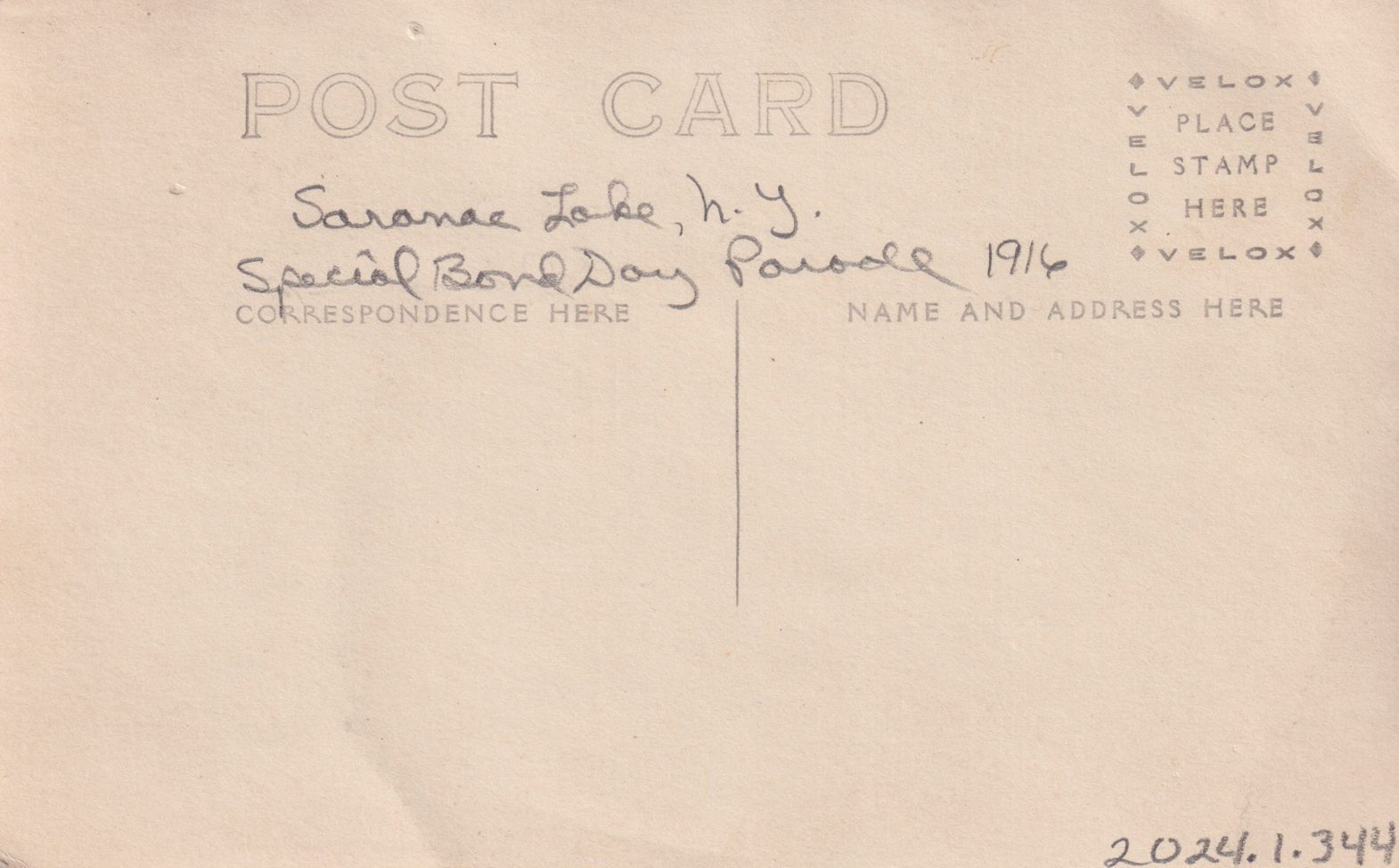 Postcard with a photograph of the Special Bond Day Parade on Main Street, 1916.