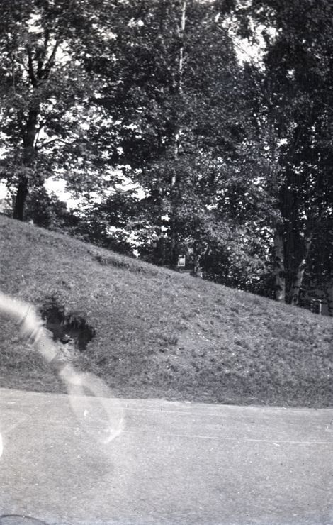 Negative of a grassy incline with trees behind it. There is a tennis court in the foreground of the image, and a blurry hand holding a racket can be seen at the left of the image. Most likely taken by Mary Ives Baldwin. This item is not fully cataloged but has been uploaded so the image is publicly available; if you would like us to prioritize cataloging this item, please contact the HSL Collections team.