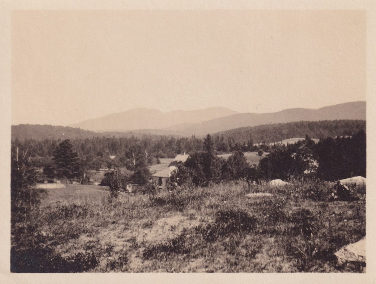 Black-and-White photograph of unidentified buildings at Bartlett Carry Club seen from a distance. Handwritten note on reverse reads, “1925.”